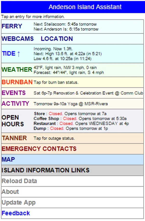 If you are an Anderson Island (Washington) resident or visitor, this app is a 'must-have'. It will give you instant access to a wealth of up-to-the-minute Anderson Island information.  This includes:
