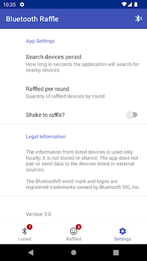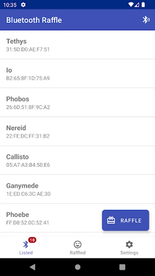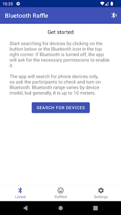 Bluetooth Raffle aims to help you find and raffle devices using Bluetooth instead of small pieces of paper. You can use it to raffle for gifts or souvenirs in lectures, events, among friends, and much more! Ask the participants to turn on Bluetooth, then search for devices and raffle!