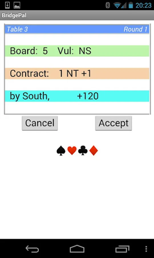 There are no charges for the BridgePal app or for any of the PC software components and no usage charges whatsoever. A bridge club need only pay for the hardware - android phones or tablets, a wifi router, and a PC to run the scoring software. By using low cost android phones, a system can be put together for a fraction of the cost of a configuration based on old fashioned purpose built wireless scoring units. Android scoring units also provide a better display and take up much less space on the bridge table.