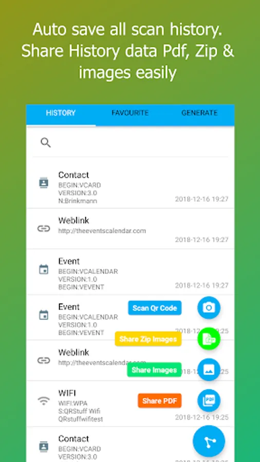 QR code scanner & Barcode Scanner also offers a full array of sharing options to share content with your friends and others by using direct contact methods or well-known social networks (Facebook, Twitter, WhatsApp…).