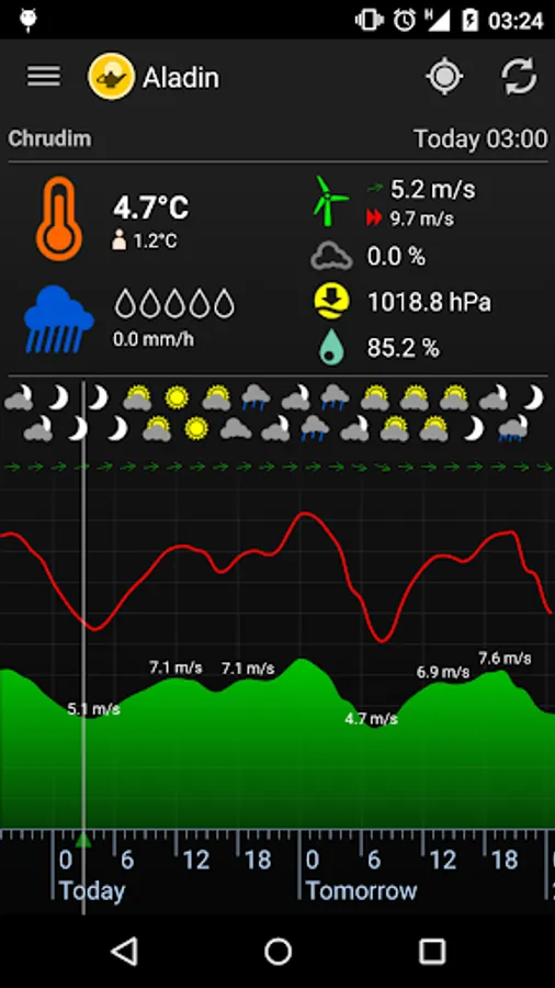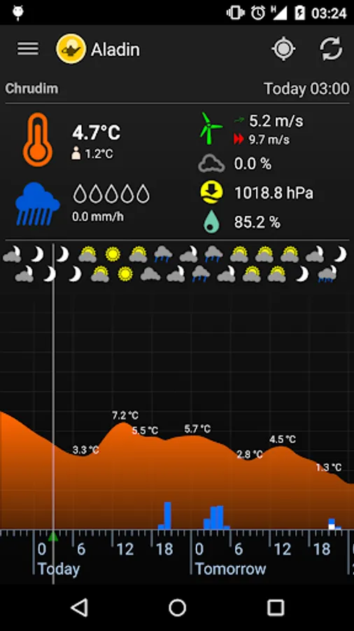 Obrovskou výhodou aplikace Aladin je bezesporu aktuálnost. Veškeré informace, které jste třeba ráno u předpovědi v televizi získaly, už nemusí být tak úplně aktuální a nepříjemná sprška cestou z práce bez deštníku nepotěší. Aladin vás dokáže zásobovat těmi nejčerstvějšími informacemi, jež se v centru Českého hydrometeorologického ústavu objeví.