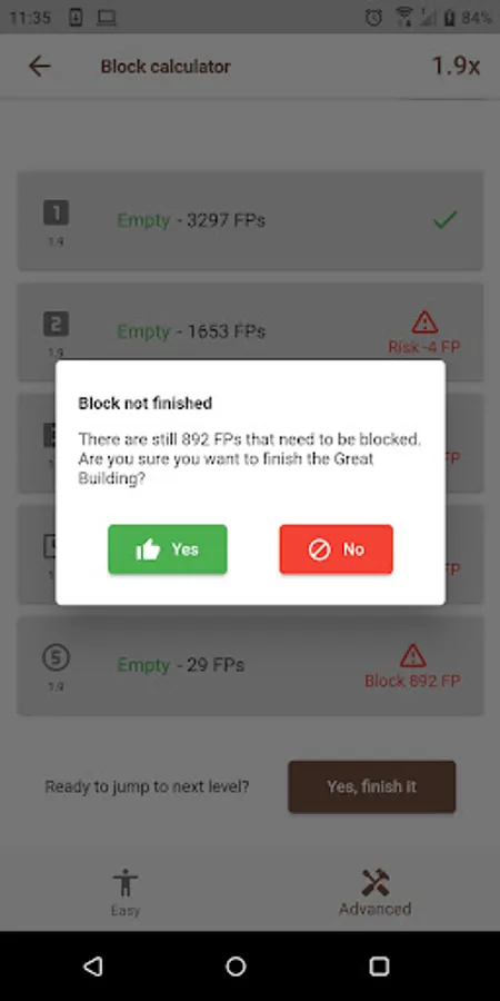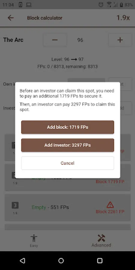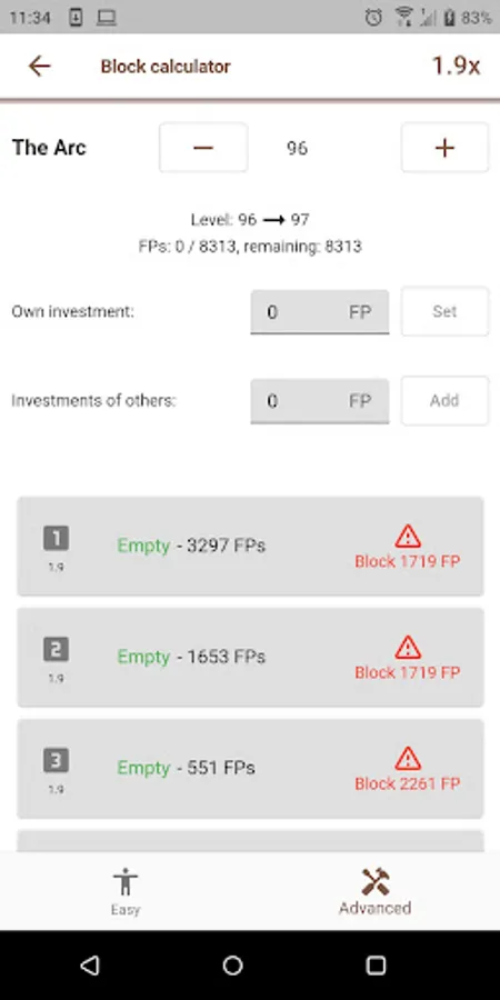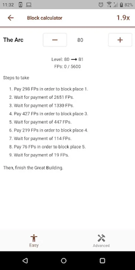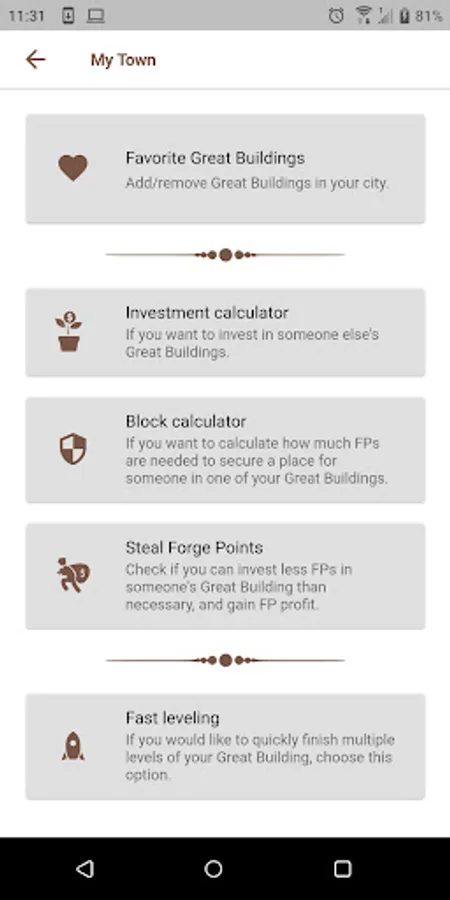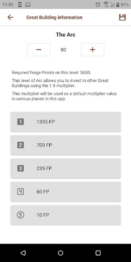 This application will help you with some aspects of the "FOE" game. For example, you will be able to conviniently calculate the amount of FP investment to put in another players Great Buildings, as well as the amount of block FPs you need to pay in order to secure a place in one of your Great Buildings.
