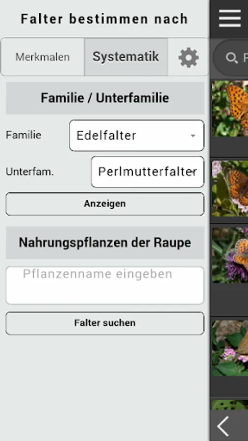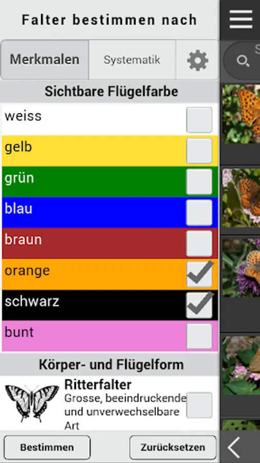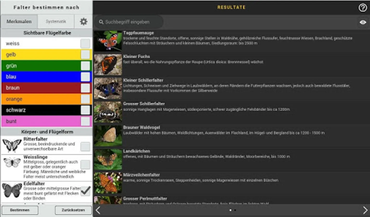 About typing recognition features (Table features), such as wing color, wingspan, dissemination and body and wing shape, a selection made and then are appropriate in the determination criteria Falter in an overview list (Table results) are displayed with a picture and short description.