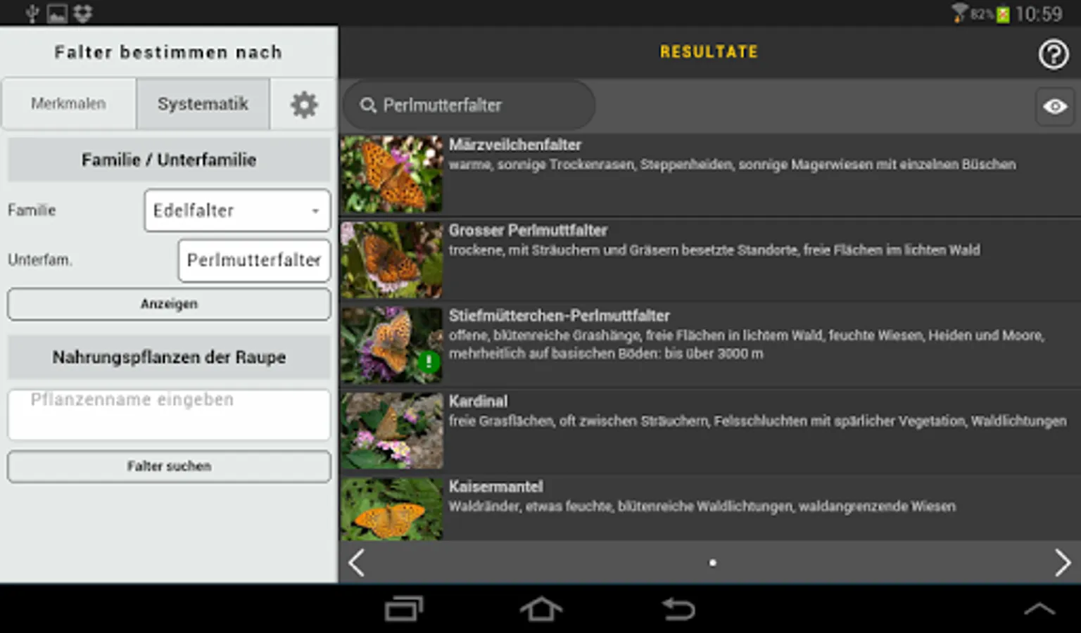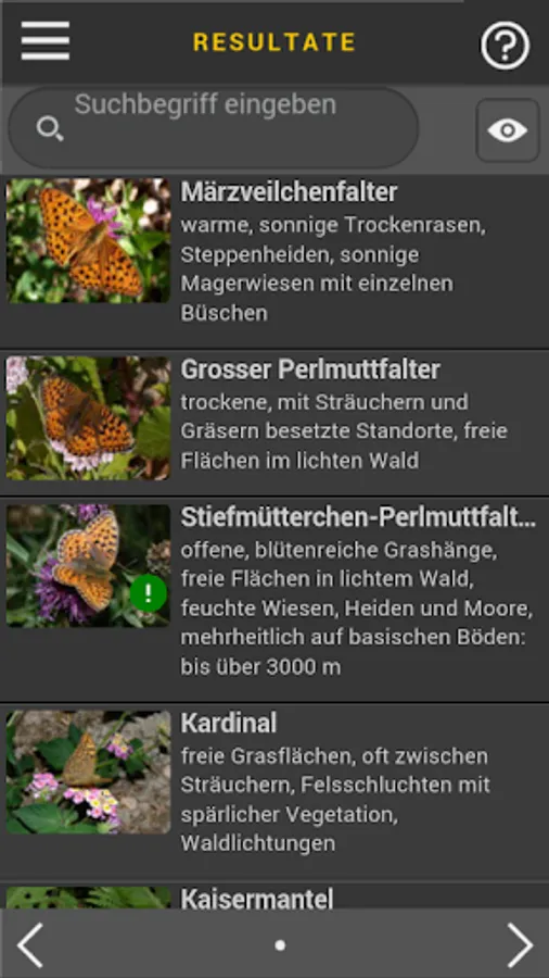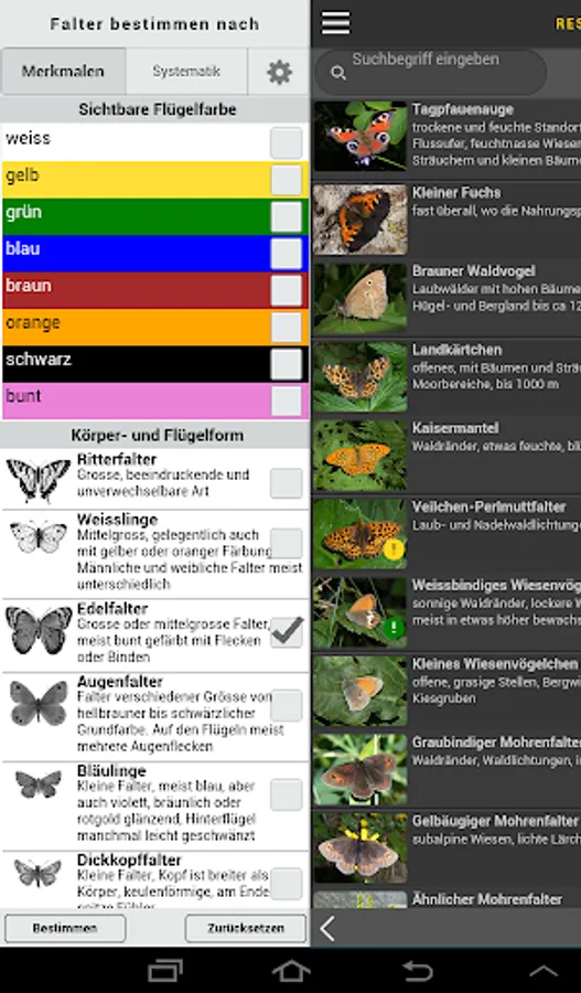 In the overview list, a search function by name (German or Latin) is integrated and butterflies can be marked as seen.