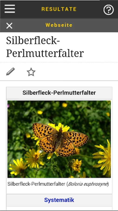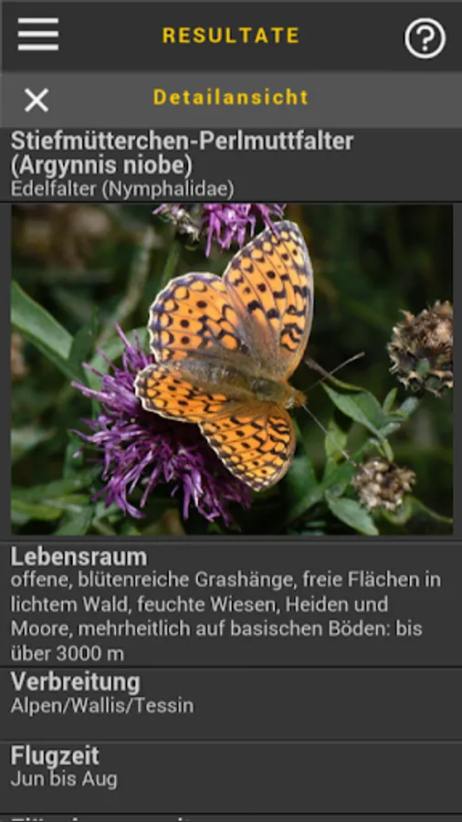 In the detail view additional data and images for more accurate determination directly from the app in German Lepiforum (provision Help for the proven European butterfly species), on the site nature-butterflies and in the German Wikipedia can be accessed.