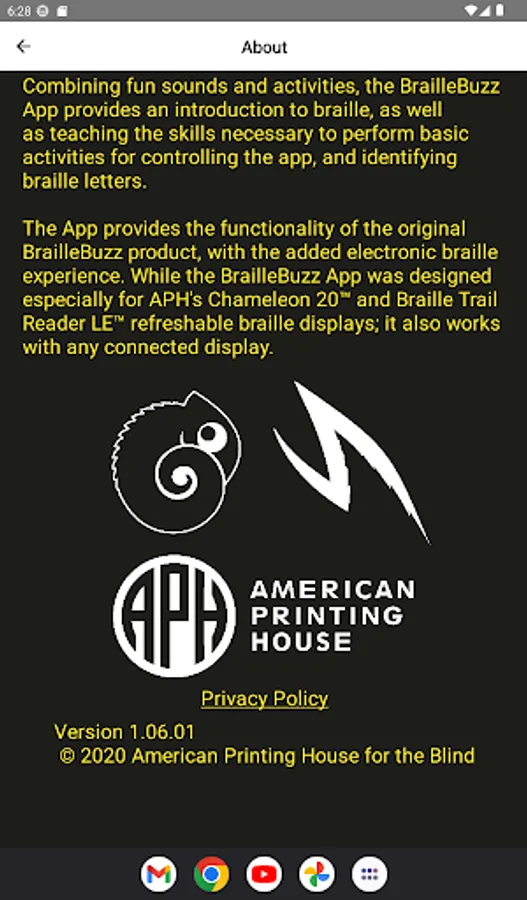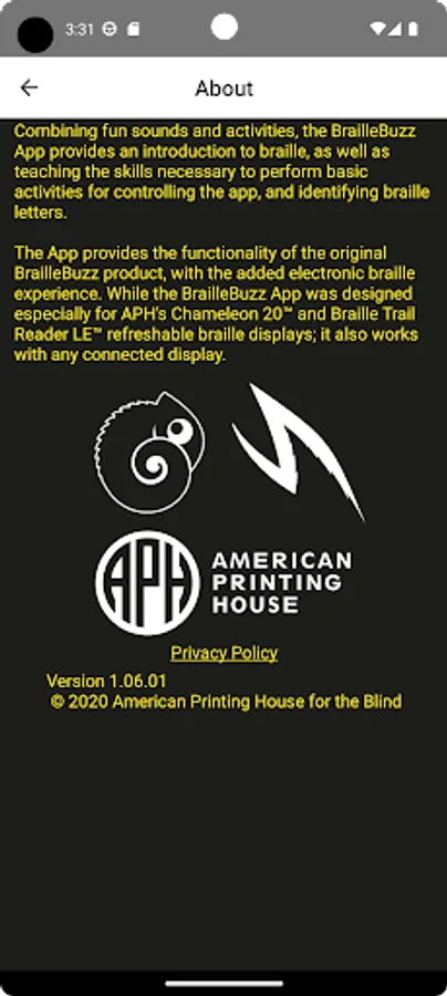 The App provides the functionality of the original Braille Buzz product, with the added electronic braille experience. While the Braille Buzz App was designed especially for APH's Chameleon 20™ and Braille Trail Reader LE™ refreshable braille displays; it also works with any connected display.