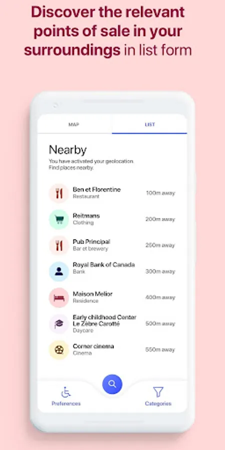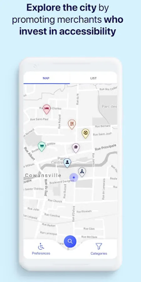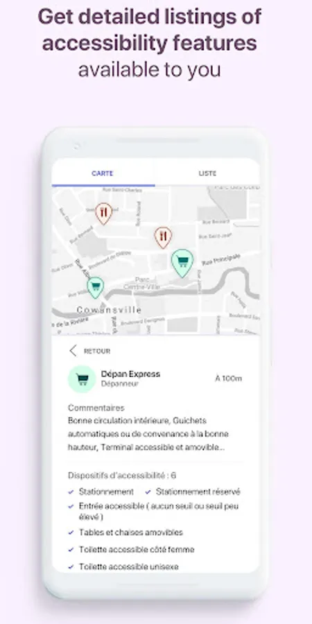 EasyAccess allows people with disabilities or reduced mobility to check with a free application downloadable on their smart phone which places they plan to go are accessible and what services are offered (entrance slope, toilet adapted, elevator, etc.).