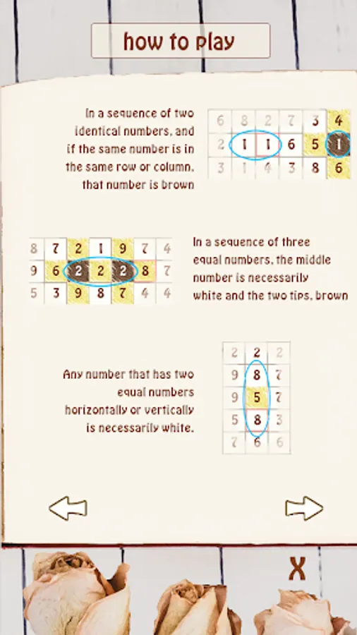 Hitori is played with a grid of squares or cells, with each cell initially containing a number. The game is played by eliminating squares/numbers and this is done by blacking them out. The objective is to transform the grid to a state wherein all three following rules are true: