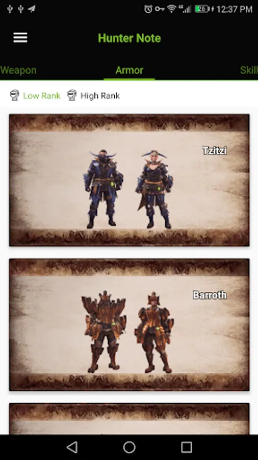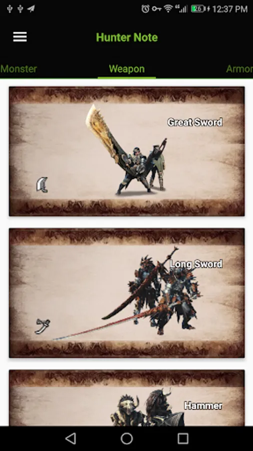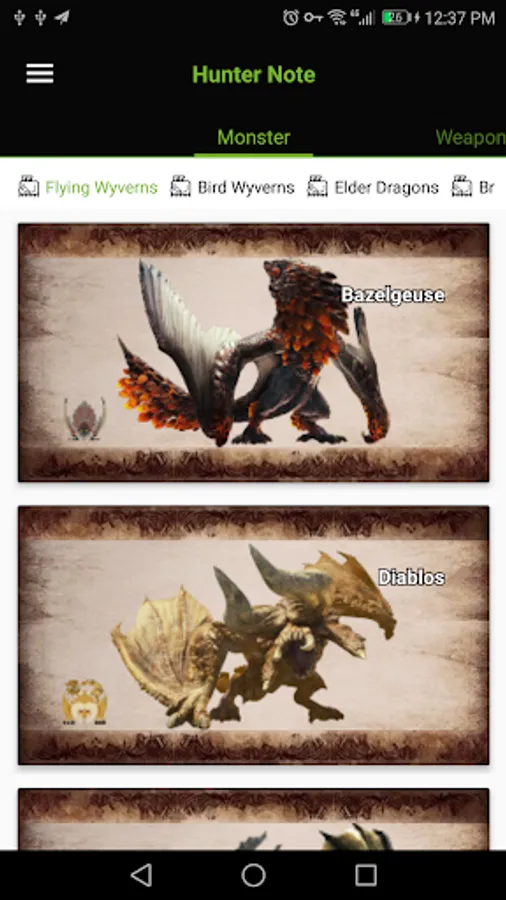 Hunters can search the latest data about Monster Hunter World's Monsters、Weapons、Armors、Skills、Charms and Decorations at anytime and anywhere by this application.