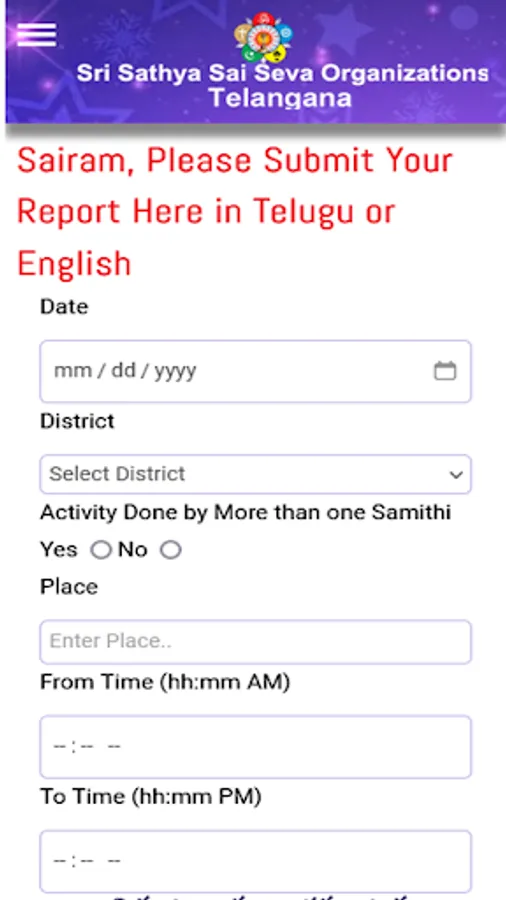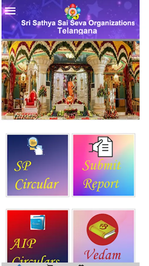 This is official app of Sri Sathya Sai Seva Organization, Telangana State). Here devotee can view activities, samities, SP Circulars, Vedam, Submit Report, BalaVikas etc