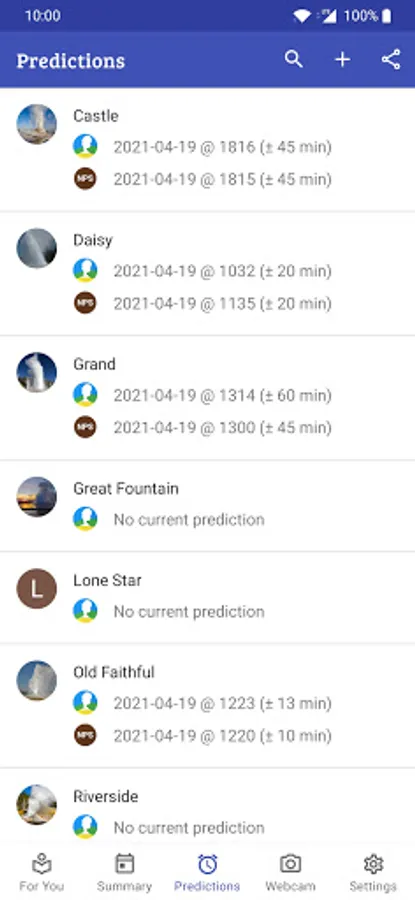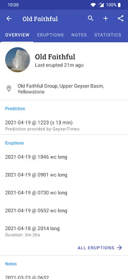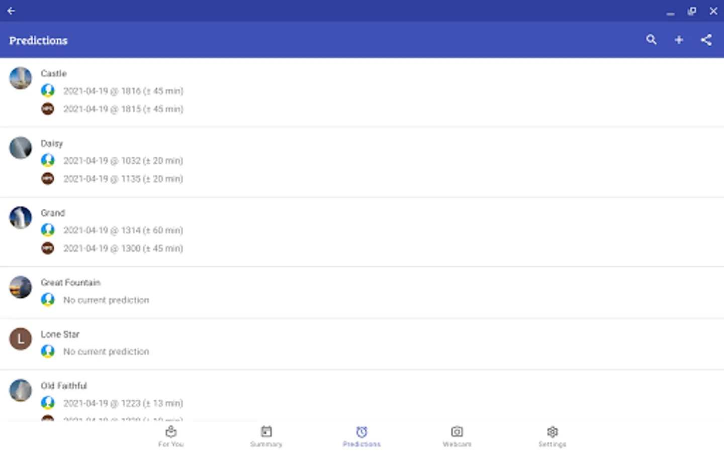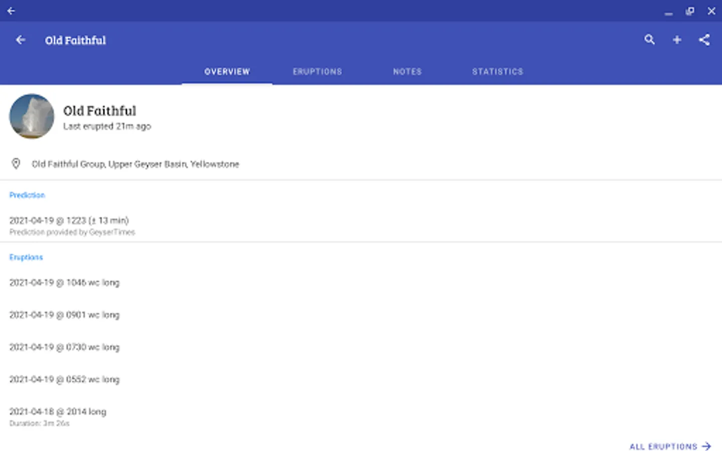 • View predictions made by GeyserTimes, which are available for additional geysers and recalculated while offline.