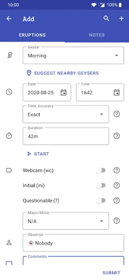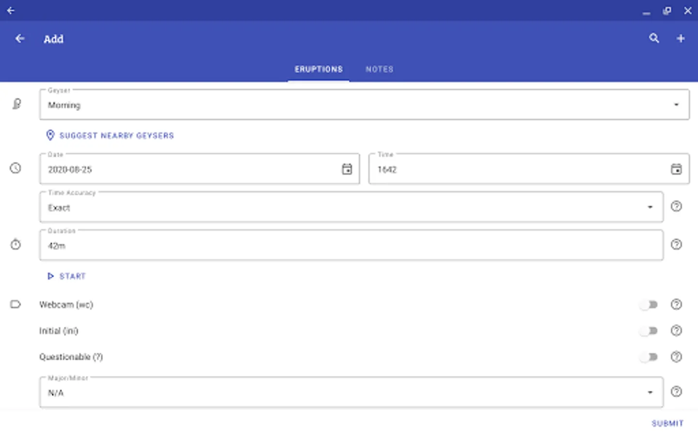 • Location Permission: used to suggest nearby geysers. If you deny this permission, suggestions will be based on your last entered eruption instead.
