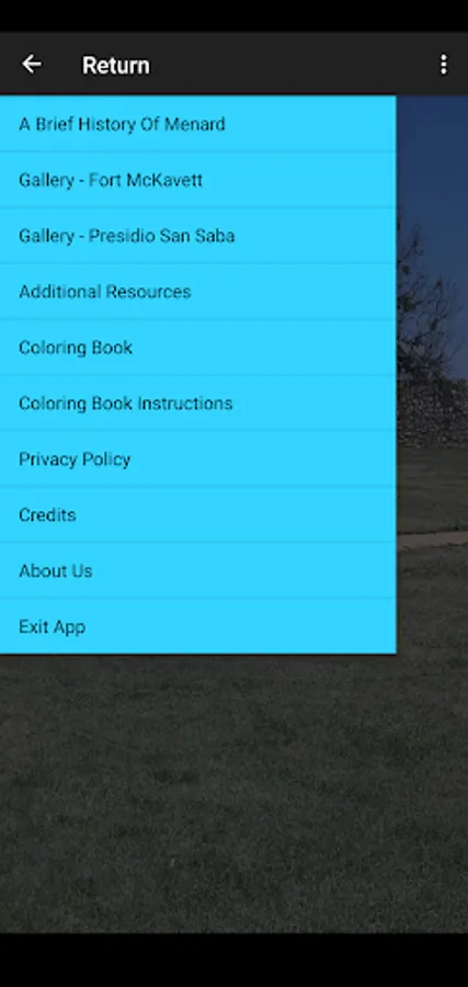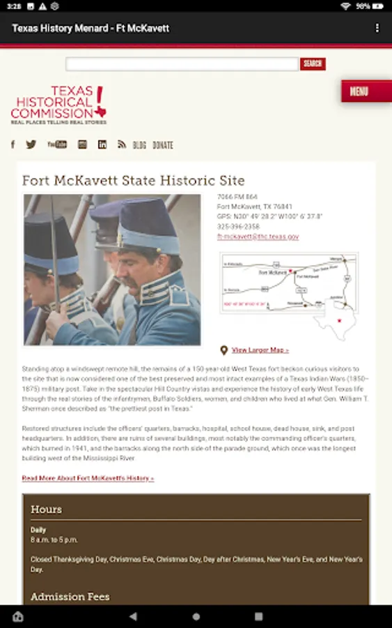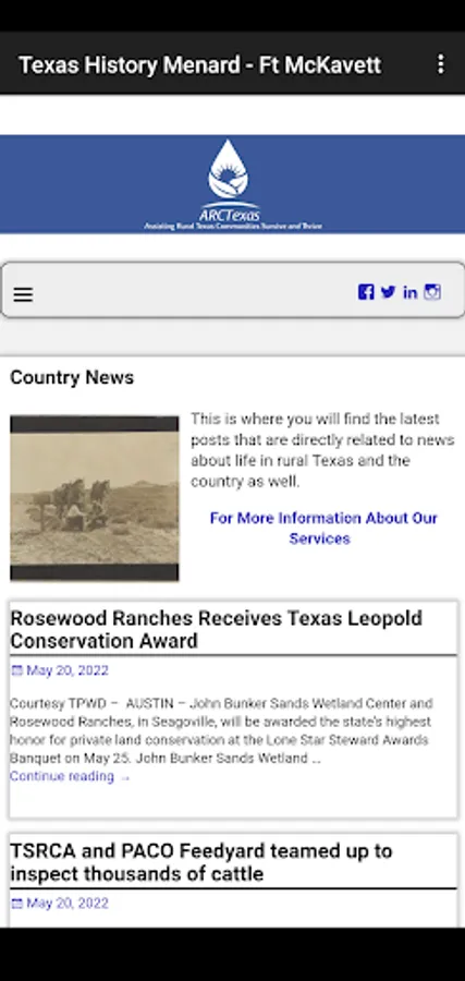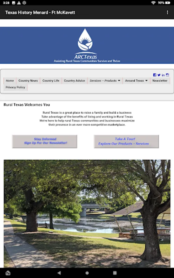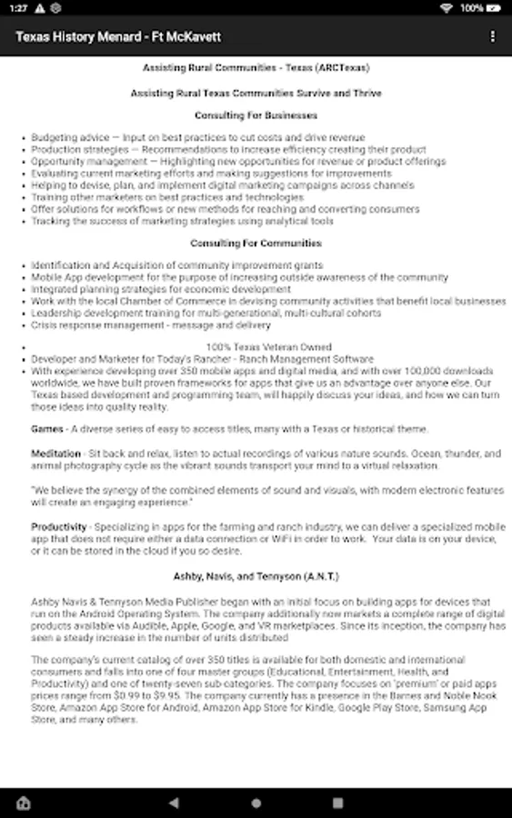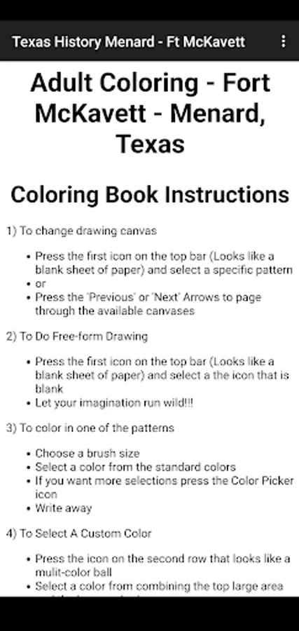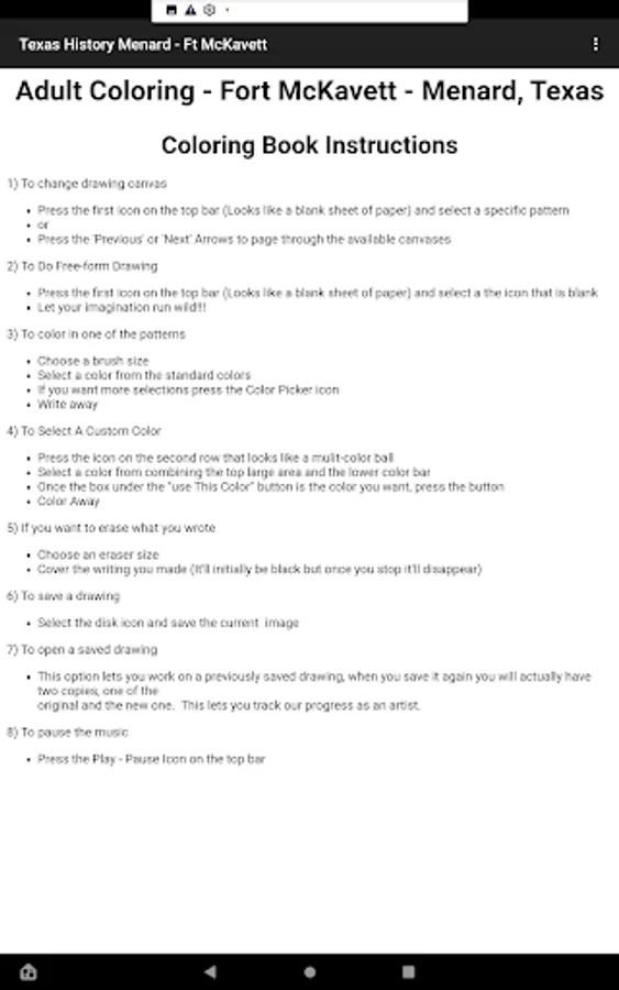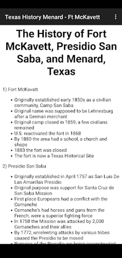 This app contains A brief history of Ft. McKavett, Presidio San Saba, and Menard, Texas. It includes photo galleries of both Ft. McKavett and Presidio San Saba. It also has a coloring book, where the art work can be saved and revisited. There are also links to sites with further information on Menard, such as the Menard Chamber of Commerce, the actual sites for Fort McKavett and the Presidio San Saba. There is also a link to our home website which contains news and information for rural communities in Texas.