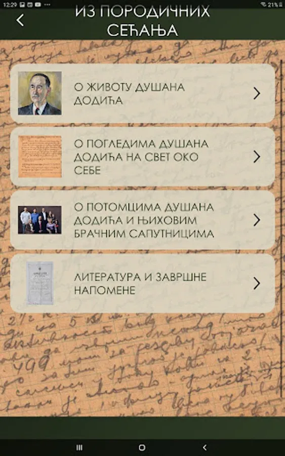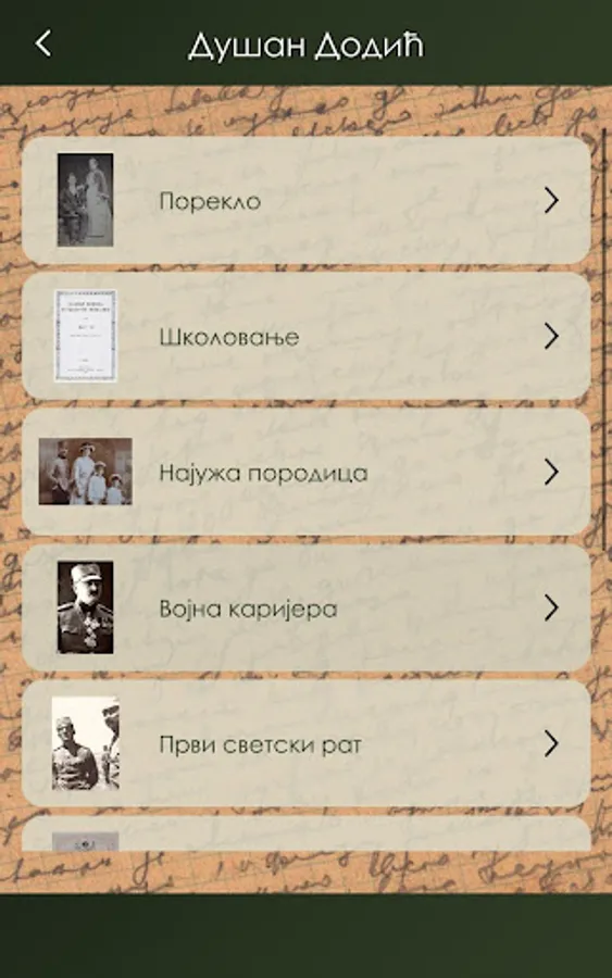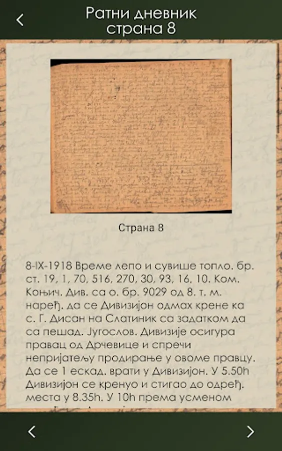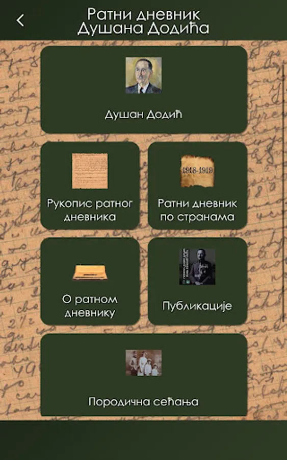 The First World War (1914-1918) or as it is also called the Great War in the Serbian army gave birth to many known and unknown heroes. Among the well-known heroes of the mentioned war is Dušan Dodić, a cavalry officer who was on duty in the Cavalry Division. Commanding the operational division of the Cavalry Division at the time of the breakthrough of the Thessaloniki front, he contributed to the breakthrough of the front and stood out during the pursuit of the defeated enemy, performing bold incursions that brought surprises. He liberated many places in Macedonia and Serbia, forced the Danube near Smederevo and took a number of places in Banat. For his successful work, he was praised by the competent command and decorated with numerous domestic and foreign decorations. He left precious records about those glorious days in the form of a war diary. The diary that is part of the legacy of Dušan Dodić, which is kept in the collection of the History Department of the Homeland Museum in Jagodina, was a good starting point to create an application about Dušan Dodić, one of the heroes of the Great War.