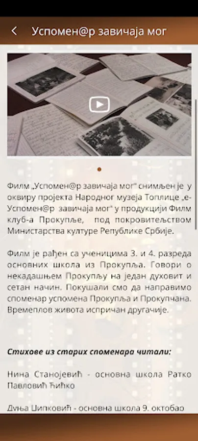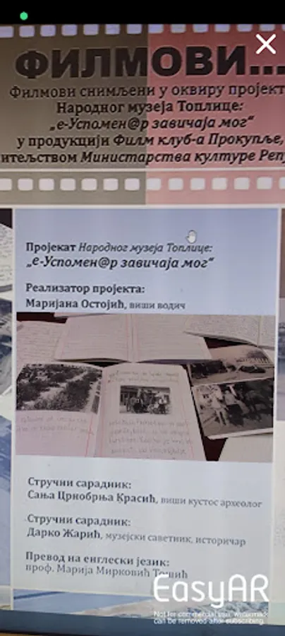 The application was created for the multimedia exhibition "e-Uspomen@r zavičaja mog". Using the application and augmented reality technology, films are shown about the former Prokuplje, Hisar hill and the National Museum of Toplice.