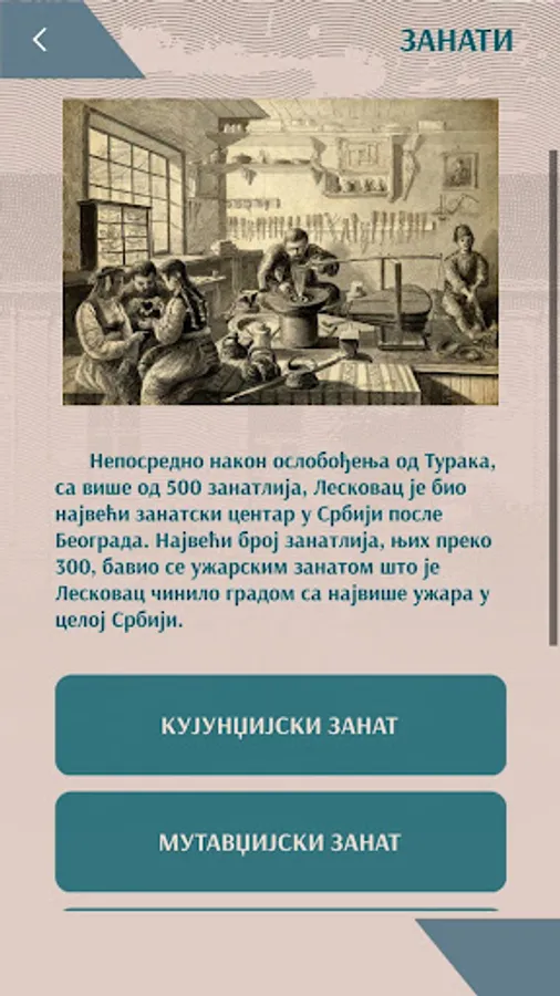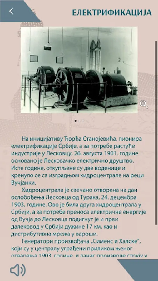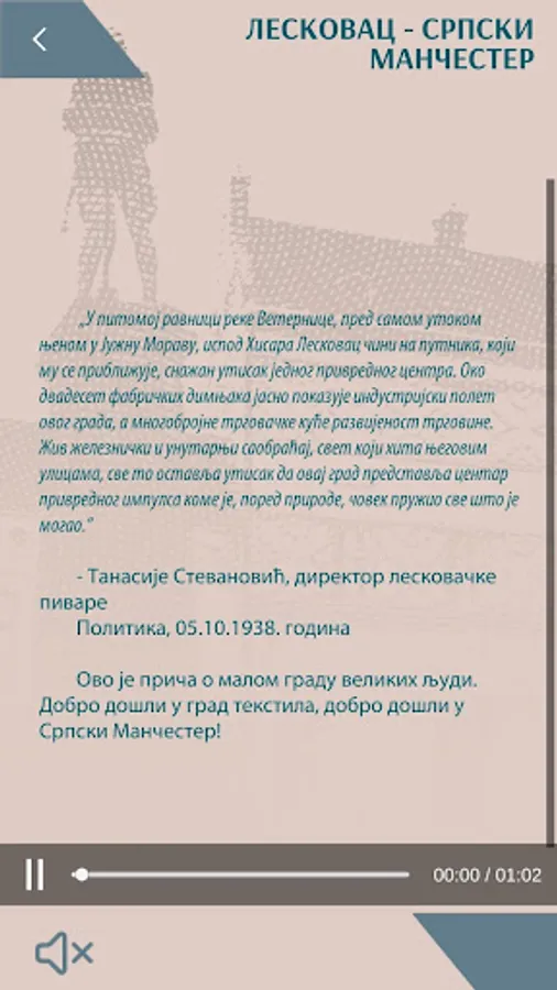 Aplikacija je višejezični multimedijalni vodič kroz Leskovac - Srpski Mančester i pruža posetiocima detaljne informacije o istorijatu i znamenitostima. Sadrži bogate galerije fotografija i tekstove o muzeju.
