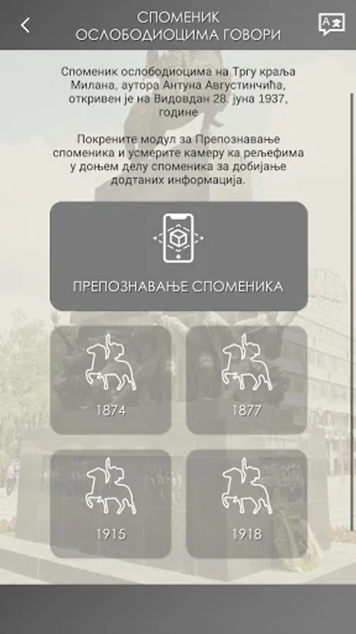 Prepoznavanjem reljefa na spomeniku koristeći modul proširene stvarnosti (Augmented Relaity - AR) u aplikaciji, prikazuju se informacije o događajima i borbi za oslobođenje Niša u 1874., 1877., 1915. i 1918. godini kao tekst, audio i fotografije.