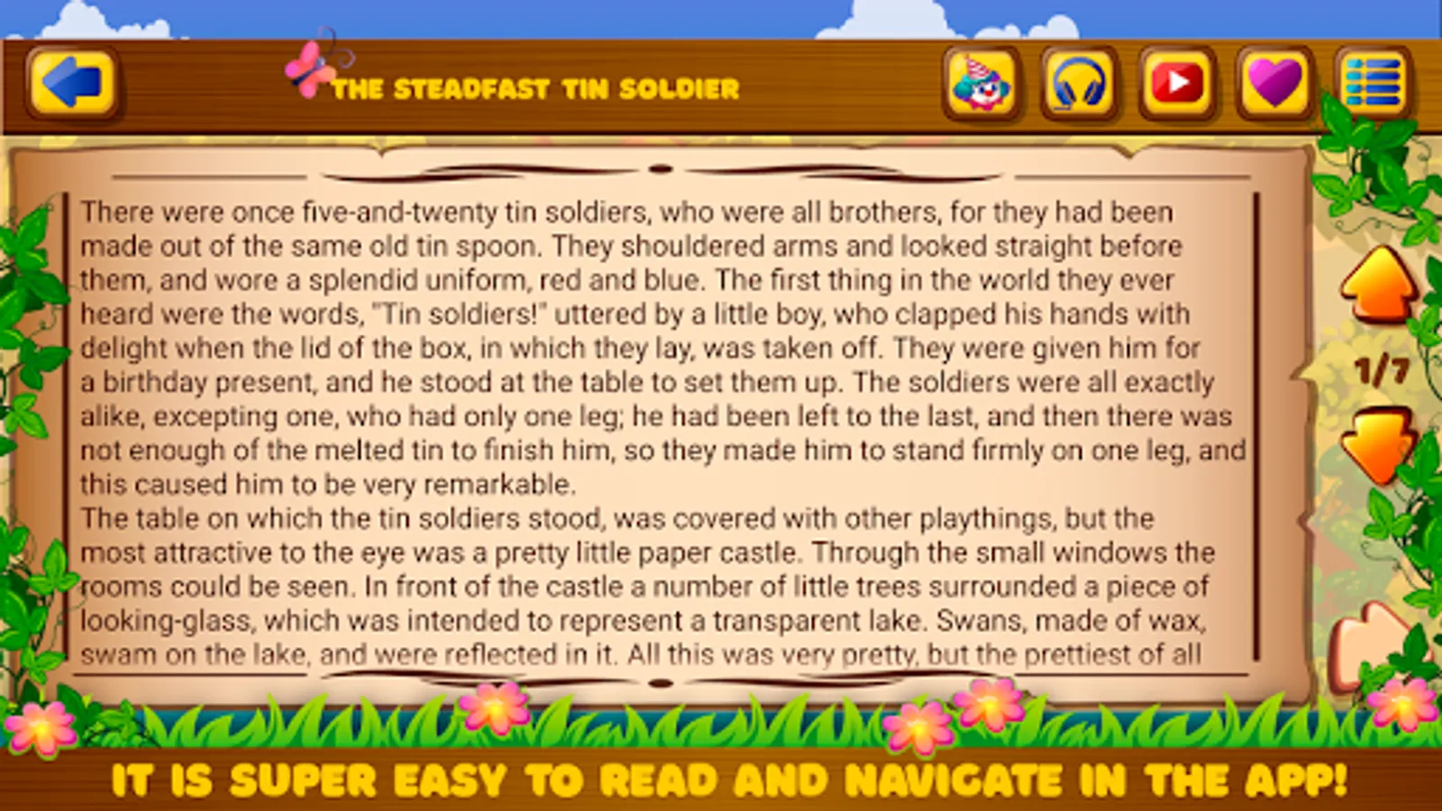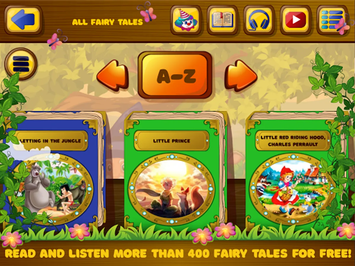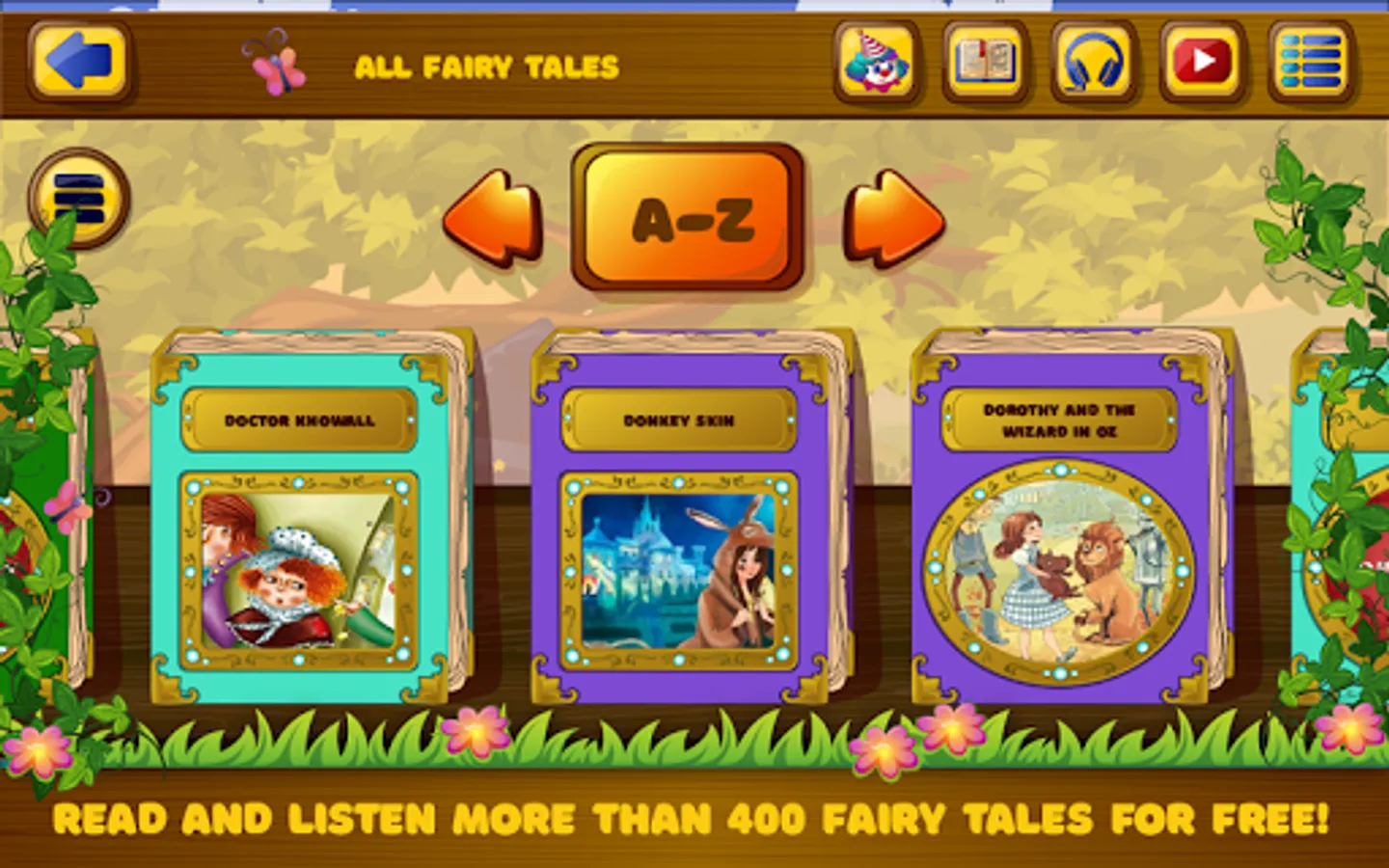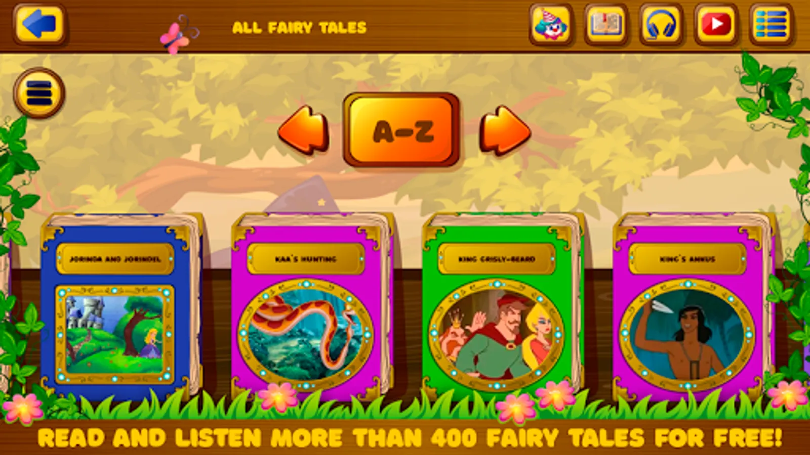 All fairy tales are divided by authors and by topics such as Tales about Princesses, Animals, Heroes, Friendship and Adventures.