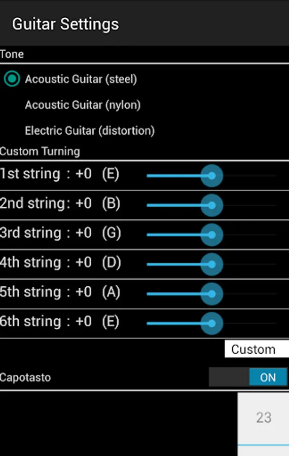 Tuning is established at the reach of -12 to +12 from standard tuning of each string.