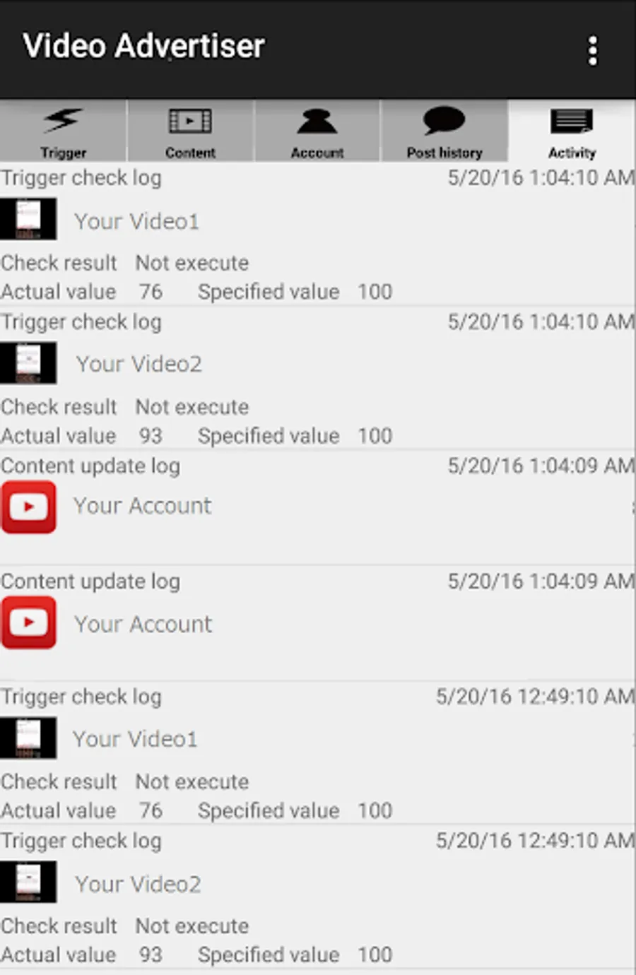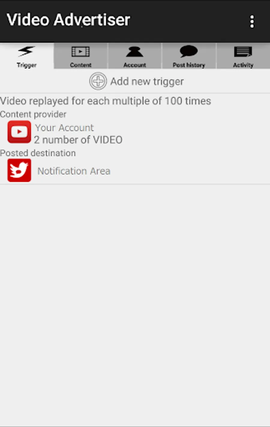 1. At first, register a YouTube account to become a content provider in the " Account" tab. And register a Twitter account to be in the same manner as in post destination.