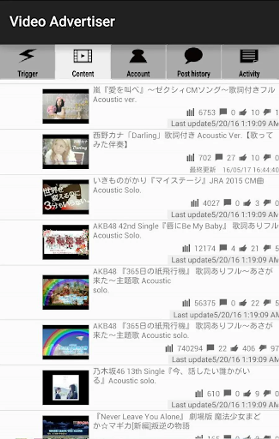 Of videos that have been uploaded to YouTube account registered in the "Content" tab, view count/comment counts/like counts/dislike counts are listed. It will be updated regularly .