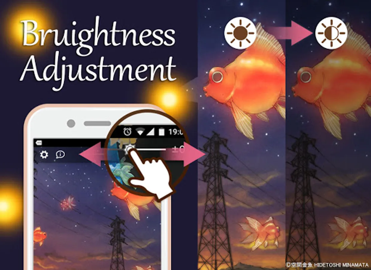 This is a Live Wallpaper app of "KU-KAN KINGYO HIDETOSHI MINAMATA". Set this app as home screen, and you can switch wallpaper by double tapping the home screen.