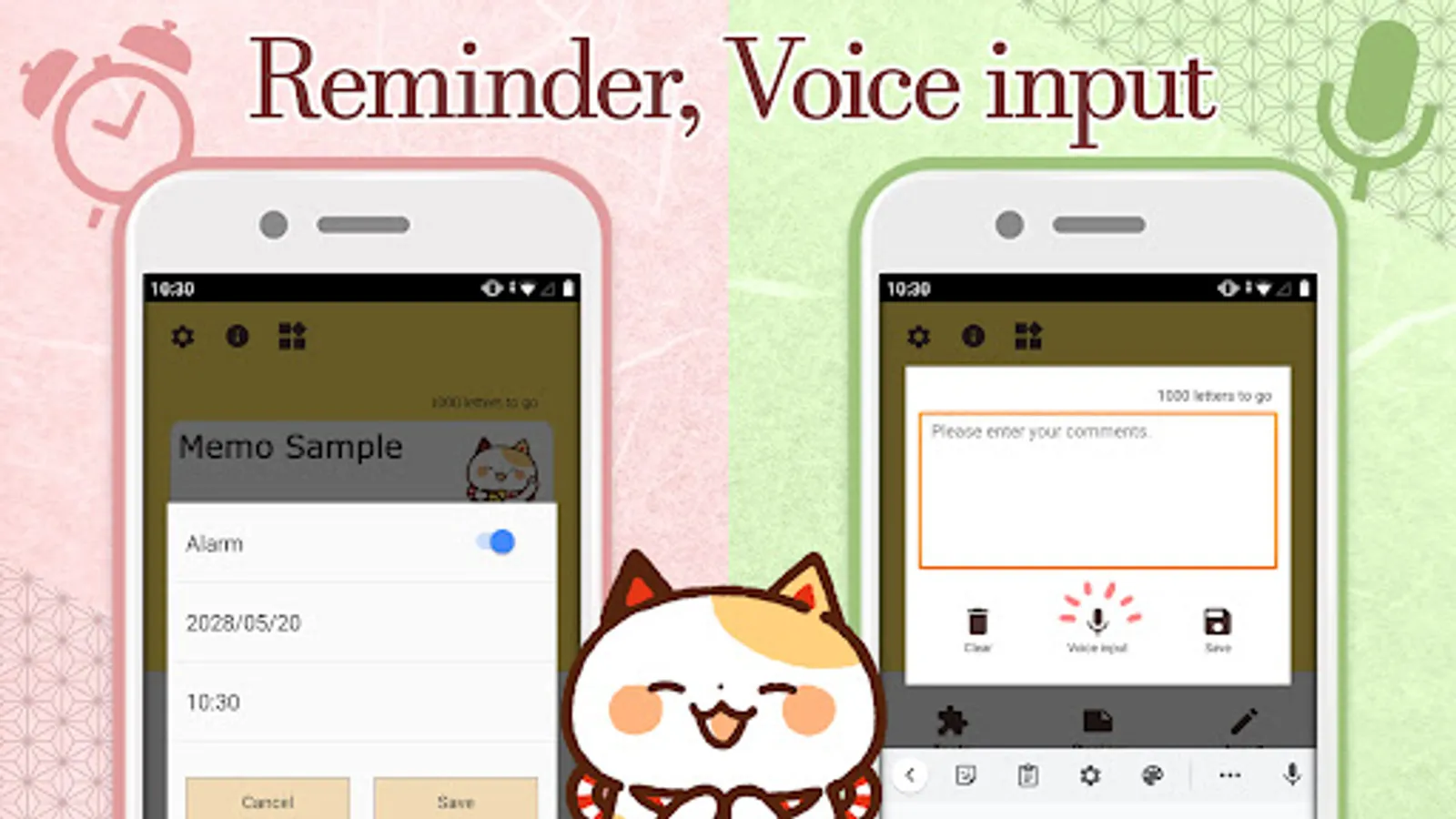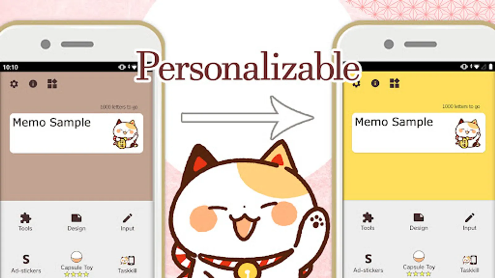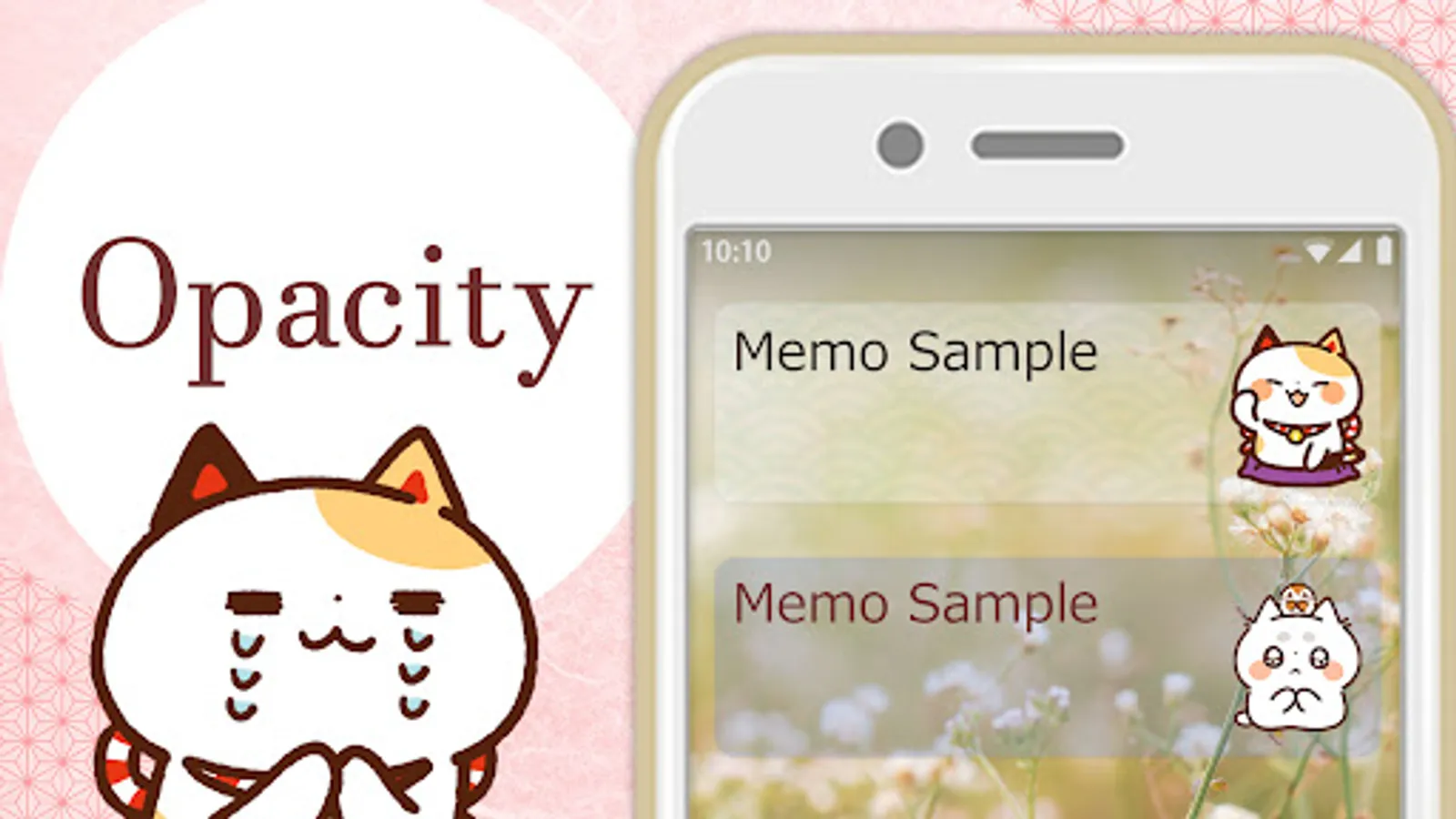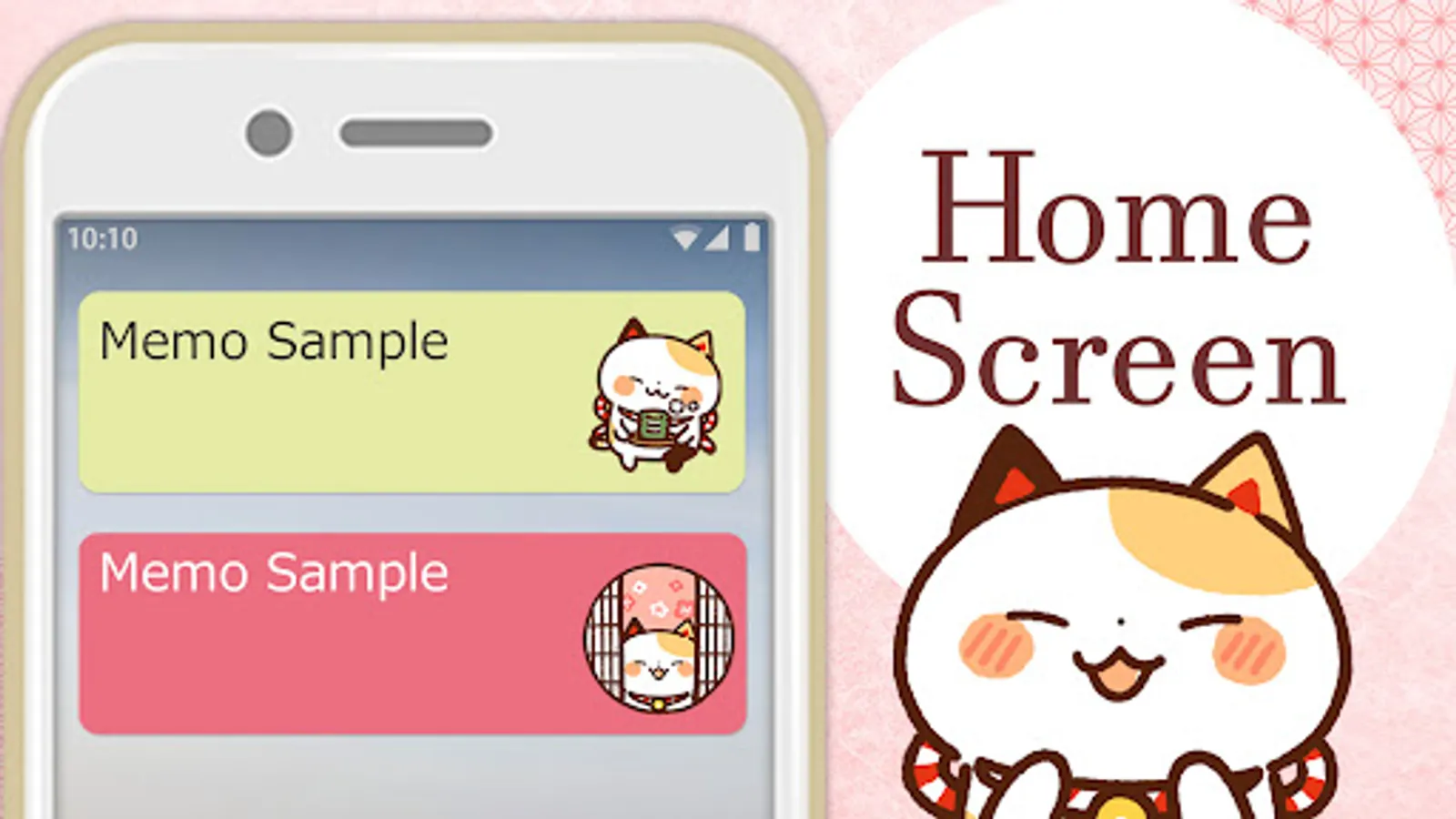 This application is a widget for your home screen and you can enjoy personalizing it. Keep pressing the home screen till an additional menu of widgets appears. Pick out “Notepad Maneki Cat” from a list of widgets.