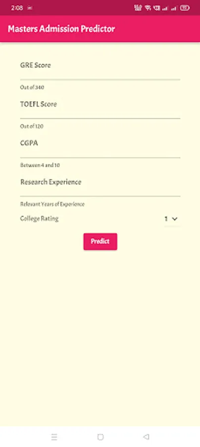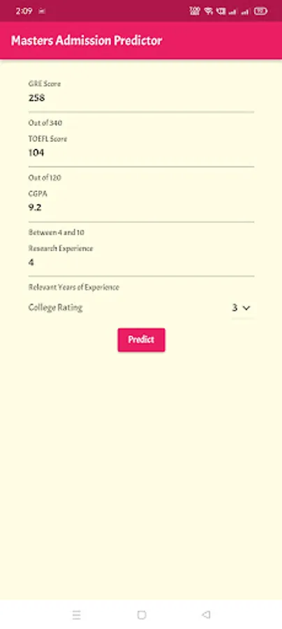 User can predict their percentage of admission in Masters on Top Universities by entering GRE, TOEFL, Research Experience, College CGPA, and University Rating.
