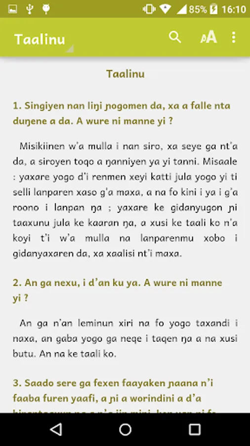 This application brings together 3 books that have been published in recent years. These are riddles (Tungutuhu), tales (Dangamaanu) and proverbs (Taalinu) in the Soninke language. The riddles and tales are in a bilingual version (Soninke-French), perfect for helping language learners. This application is ideal because you can take all these books with you and learn a lot about Soninke culture. "Sunkanyinbe" is the time when people would gather around the fire to tell each other stories. Enjoy reading.
