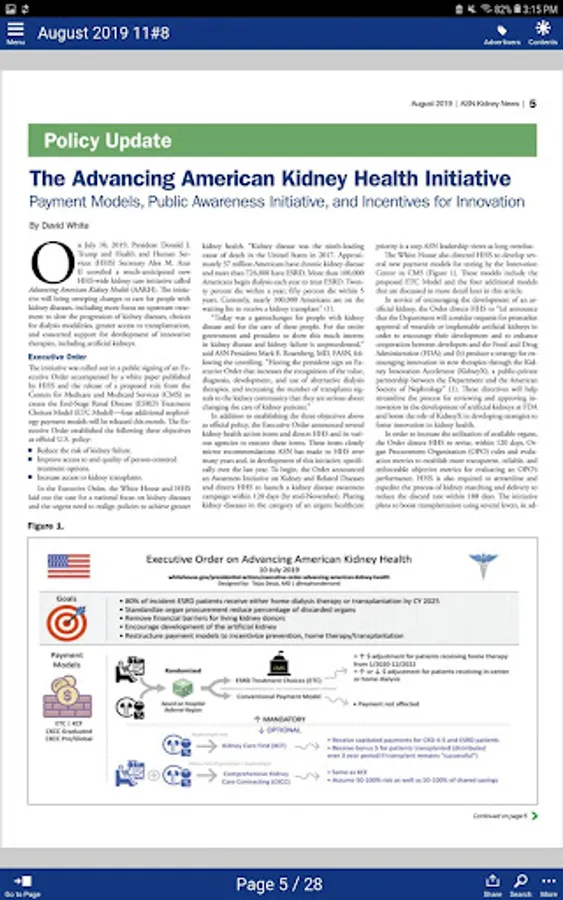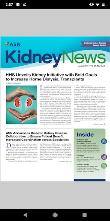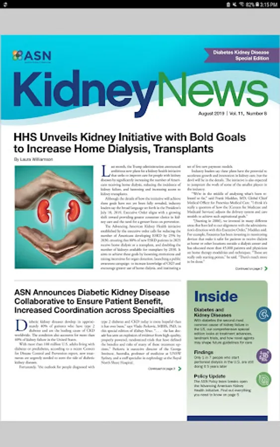 ASN Kidney News is your source for information in the world of nephrology. The news magazine examines research findings and policy changes, pinpointing emerging trends in industry, medicine, and training that impact practitioners in kidney health and disease. ASN Kidney News will provide a venue to expound upon scientific and clinical advances, with more commentary and speculation than a scientific journal can allow.