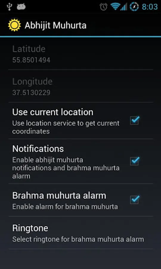 The program is designed to calculate Abhijit Muhurta, Rahu Kalam and Brahma Muhurta - special time intervals during the day. Abhijit Muhurta is favorable for all actions, events and undertakings. Rahu Kalam is an inauspicious period, when starting important tasks should be avoided. Brahma Muhurta is best time to wake up and meditate.