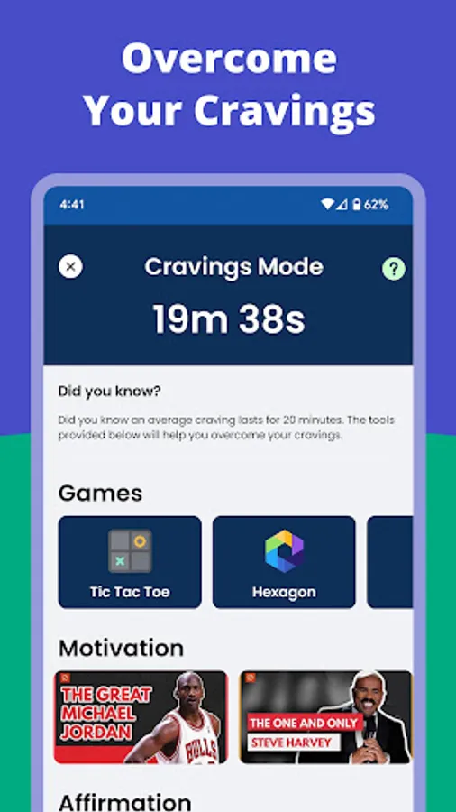 Cravings Mode: Overcoming alcohol cravings is often quite challenging. Healify addresses this challenge with an innovative cravings mode. According to research, a craving lasts about 20 minutes on average. The cravings mode helps you surf through your cravings for 20 minutes (or more) to prevent you from relapsing during this time. This feature offers practical solutions and techniques to overcome cravings without resorting to alcohol. From mindfulness exercises to distraction strategies, cravings mode equips you with the tools necessary to navigate through challenging moments and maintain your commitment to stop drinking.