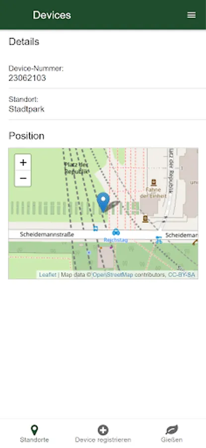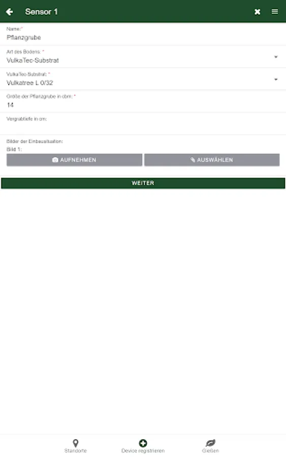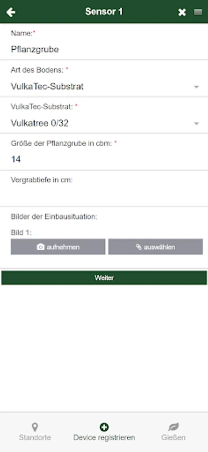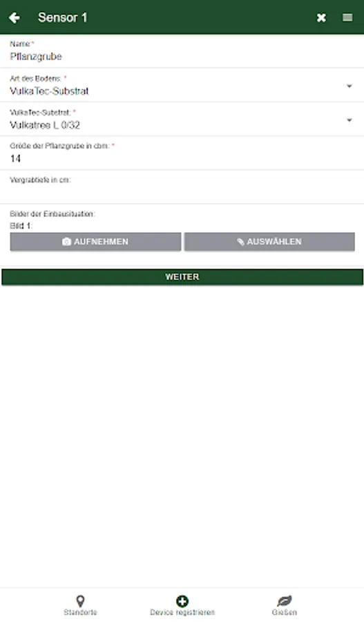 The app guides you through the installation of the sensor unit. The location is recorded using GPS (after approval), the installation situation can be documented with photos and an assignment to the respective substrate type or soil can be made. If you want, you can also take a soil sample and send it to us - then we can adjust the calibration of the sensors based on the location.