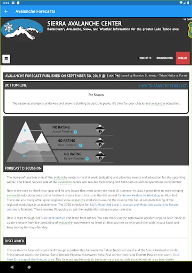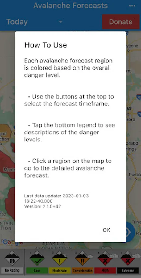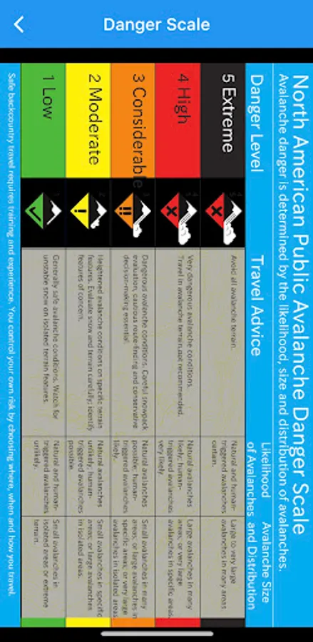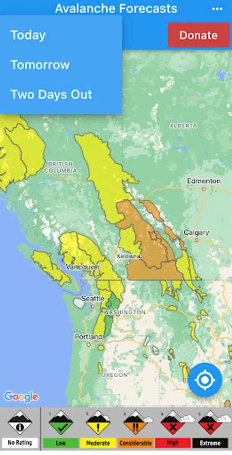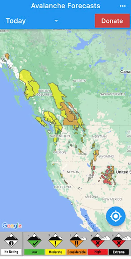 This app makes it easy to see current danger levels for every forecast center in North America. It shows the present danger by coloring the forecast regions on a map and allows people to select a future timeframe for the centers that support it (Today/Tomorrow/2 Days Out). Click on any region to view the detailed avalanche forecast from the source forecasting center.