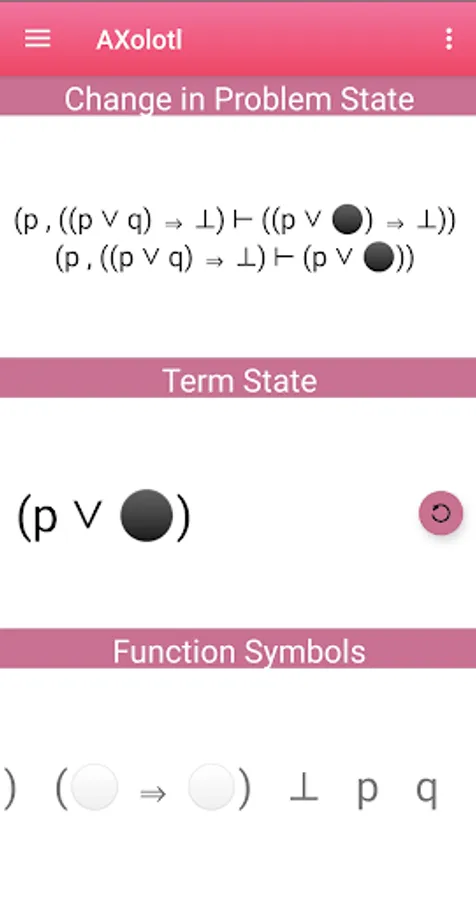 Additional problems may be loaded into the app using a simple text based file input language (AXolotl files). Note that only the following unicode symbols are allowed within