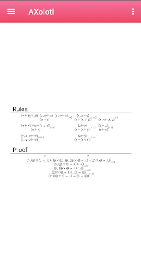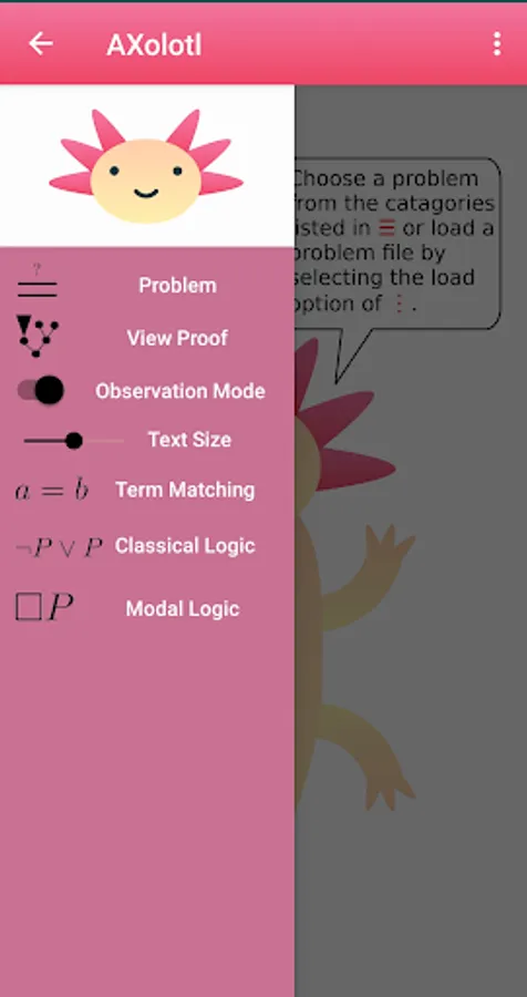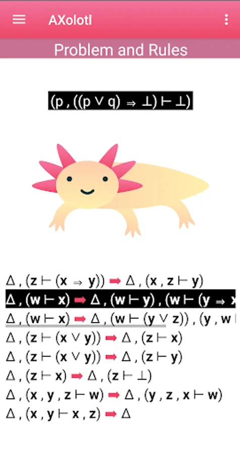Axolotl is an educational game designed for self study and training of logic and formal reasoning. The app includes a library of over 60 problems using three different logic calculi and a short tutorial to get started. Additionally, completed problems can be viewed through the included proof viewer and saved to your gallery as a jpeg image. If you would rather compile to a Latex file, the completed proof may be copied to clip board as a latex file. To learn more about the creators of the app and the supporting institutions please see the About page within the app. If you would like to support us, visit our patreon page: