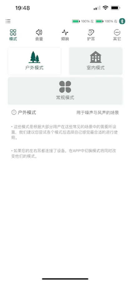 This is an adjustment software for Bluetooth assisted listening smart TWS Bluetooth headsets. The APP can quickly and intuitively operate the Bluetooth device for personalized adjustment. In the auxiliary listening mode, you can switch according to the usage scene-normal mode-outdoor mode-indoor mode, adjust the volume, etc. In Bluetooth mode, you can switch - normal mode - noise reduction mode - transparent mode.