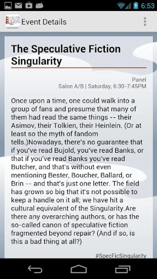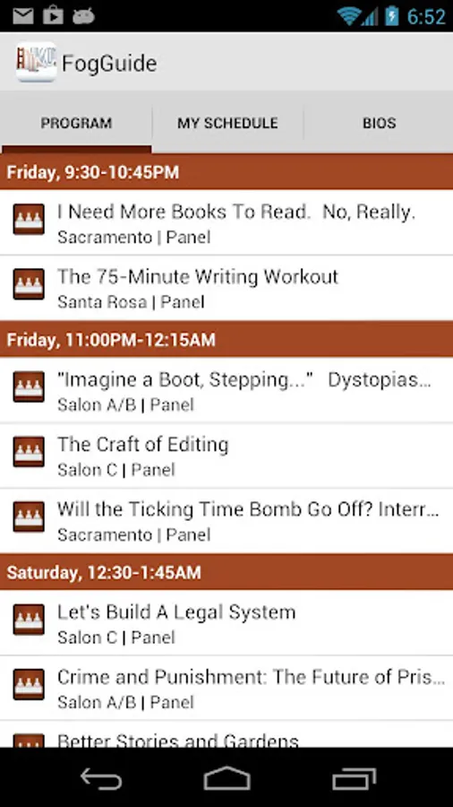 The FogGuide application provides information about the panels, events, and readings at FOGCon.