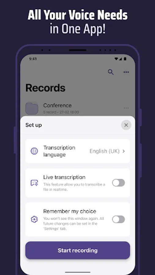 - Offline Transcription: Convert audio recording to text even without a connection.