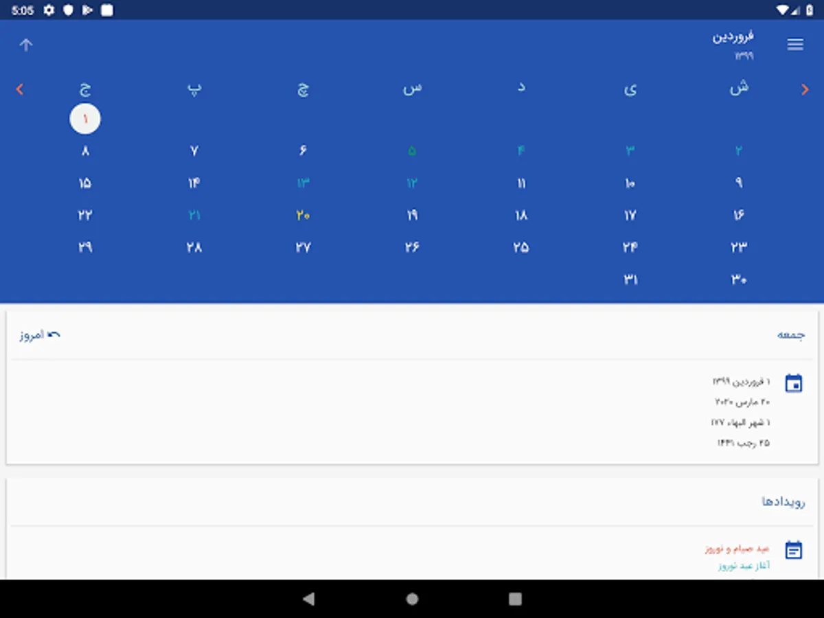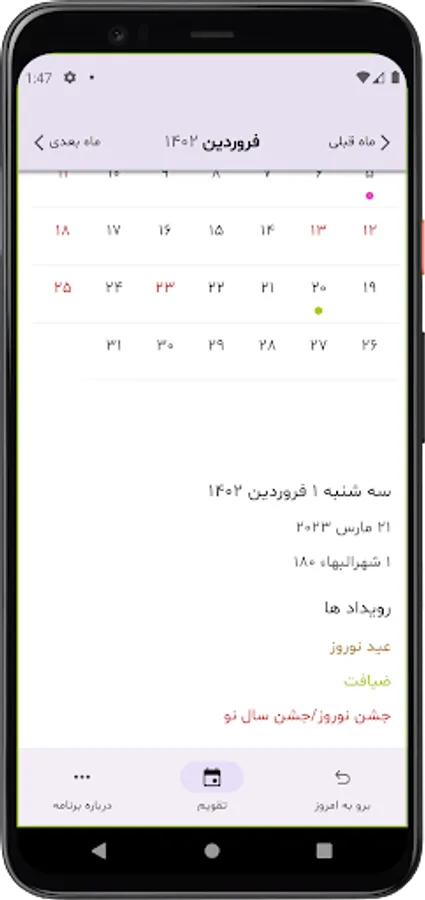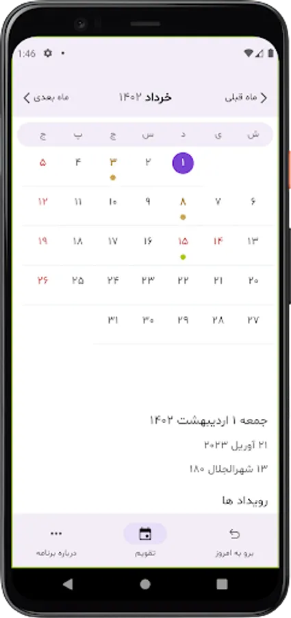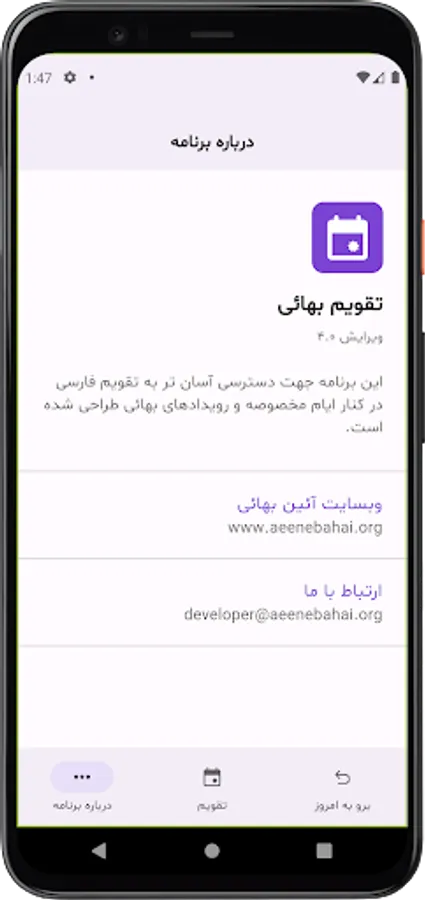 This app includes a Badi calendar that combines the Persian and Gregorian calendars. It marks the Baha`i holiday, Iran's official holiday, 19-day feasts, and other significant Baha`i events with different colors.