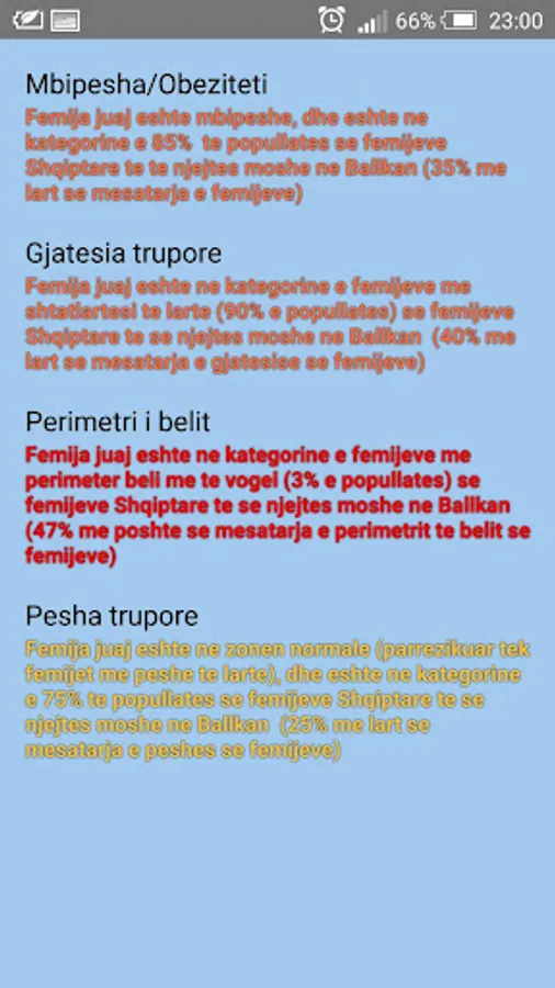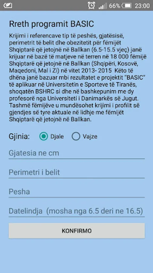 Krijimi i referencave tip të peshës, gjatësisë, perimetrit të belit dhe obezitetit për fëmijët Shqiptarë që jetojnë në Ballkan (6.5-15.5 vjeç) janë krijuar në bazë të matjeve në terren në 18 000 fëmijë Shqiptarë që jetojnë në Ballkan (Shqipëri, Kosovë, Maqedoni, Mal i Zi) në vitet 2013- 2015 Këto të dhëna janë bazuar mbi rezultatet e projektit “BASIC” të aplikuar në Universitetin e Sporteve të Tiranës, shoqatën BSHRC si dhe në bashkepunim me dy profesorë nga Universiteti i Danimarkës së Jugut. Tashmë fëmijëve u mundësohet krijimi i profilit së gjendjes së tyre aktuale në lidhje me fëmijët Shqiptarë që jetojnë në Ballkan.