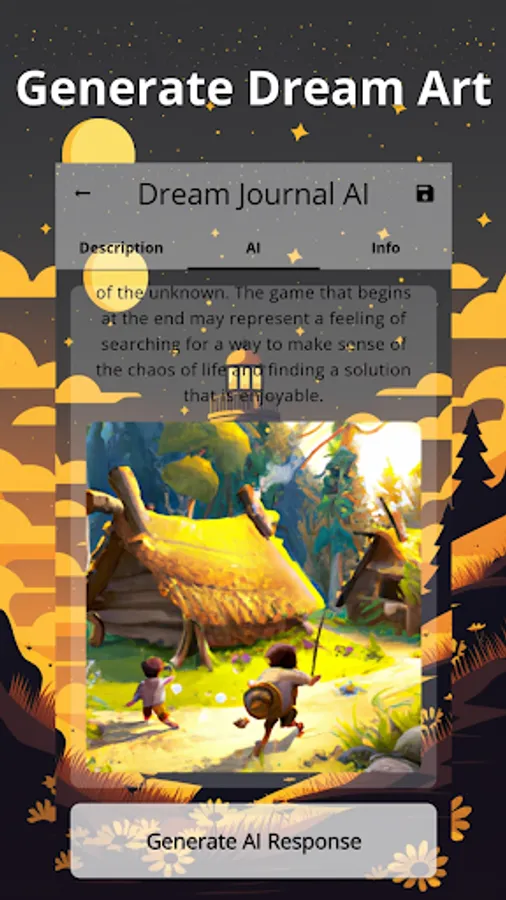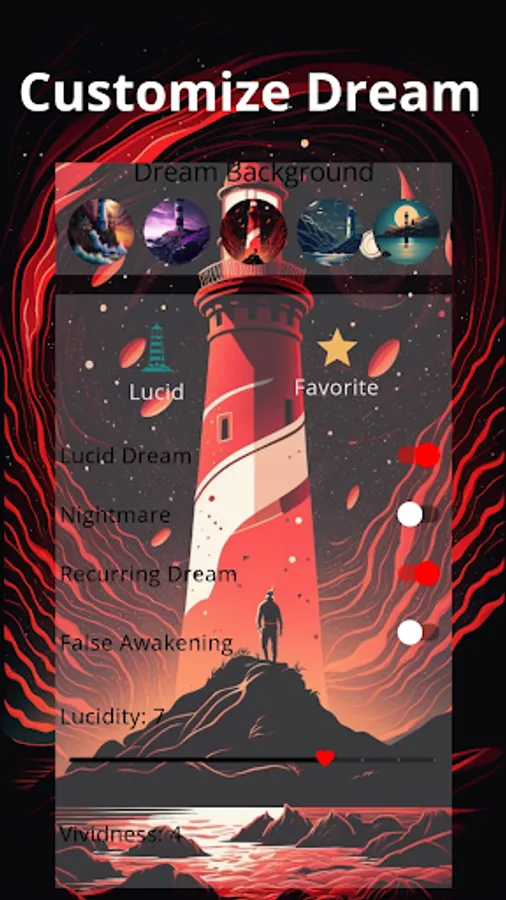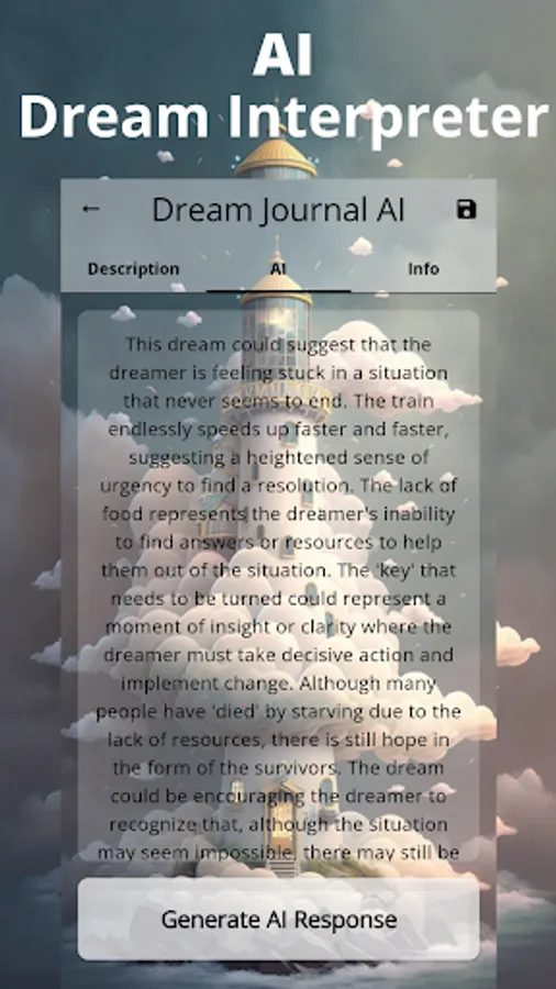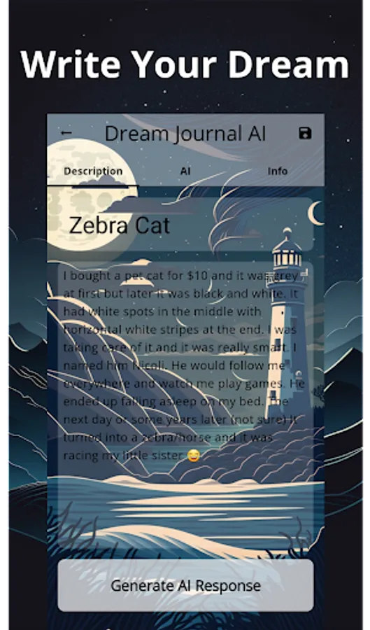 The Dream Journal AI app is a unique tool that combines AI and dream journaling to help you explore your subconscious mind. You can capture your dreams through writing, painting, and voice recordings, and the app's AI technology will provide personalized interpretations. Your dreams are safely stored in the cloud for easy access, and the app also features a dream painting feature for artistic expression and a customizable dream library for tracking patterns and themes. The lighthouse symbolizes guidance on your journey to uncover the secrets of your dreams and achieve a deeper understanding of yourself and your subconscious thoughts.