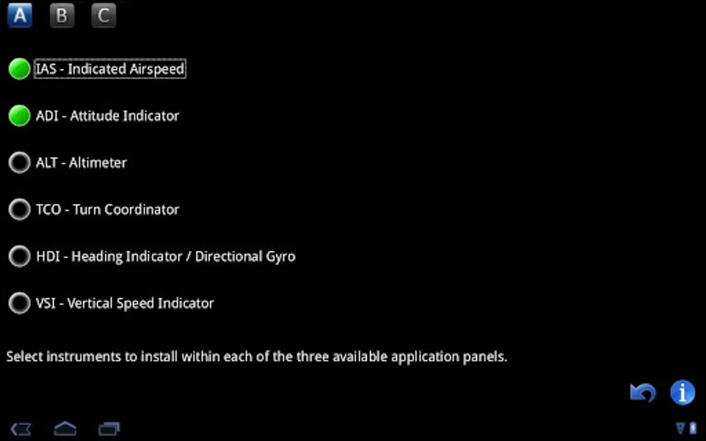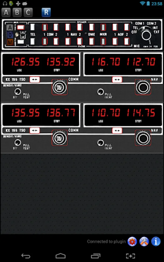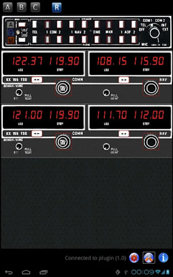 This app offers 3 separate panels: each can be configured by selecting from 6 basic flight instruments. In addition, it includes a basic radio stack with a standard Bendix/King KM24 Audio Control panel and a dual KX155 NAV/COMM System.