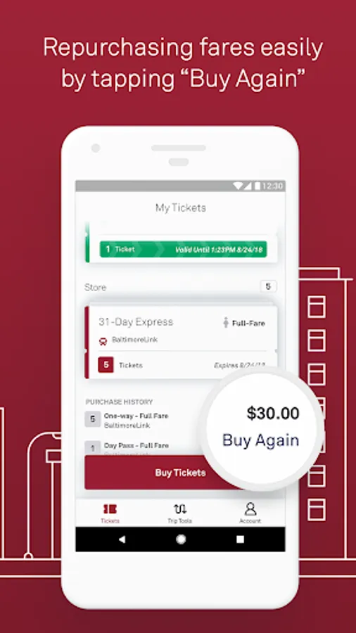 • Purchase BaltimoreLink Local Service, MARC Train, and Commuter Bus tickets all from one app.