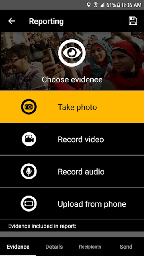 In just a few seconds, capture and share evidence of political violence, human rights abuse or corruption. Your report will embed data from your device to make it verifiable by journalists or human rights organizations.