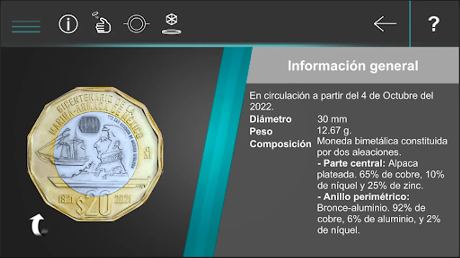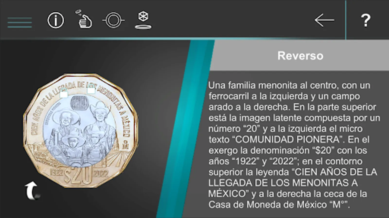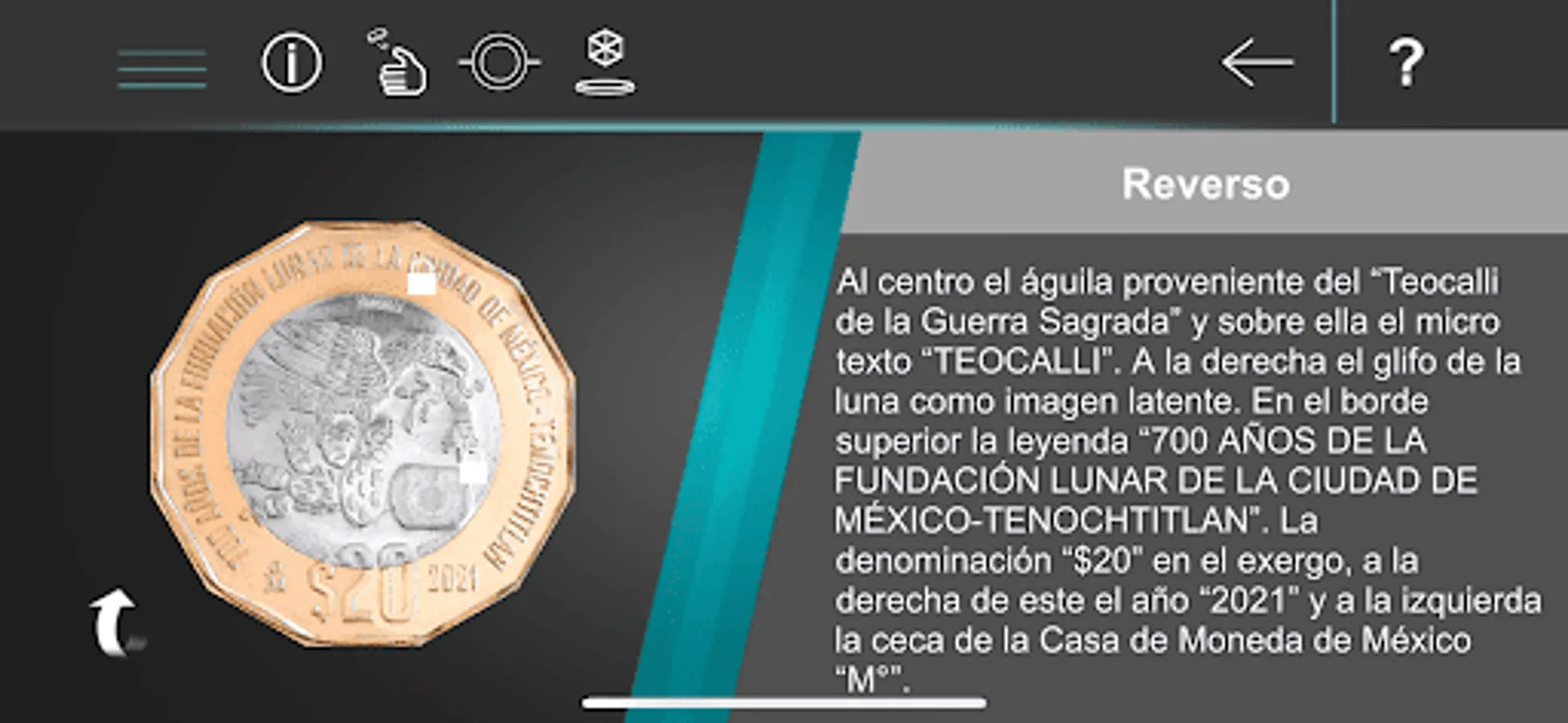 Application that allows to strengthen communication with the population through the dissemination of information on the security elements, artistic elements and general characteristics of Mexican metallic coins. For some of the 20 peso commemorative coins, the application has functionality through which you can see an animation associated with the motifs of the coin. Also included is functionality to simulate toss and hopscotch games with the selected currency.