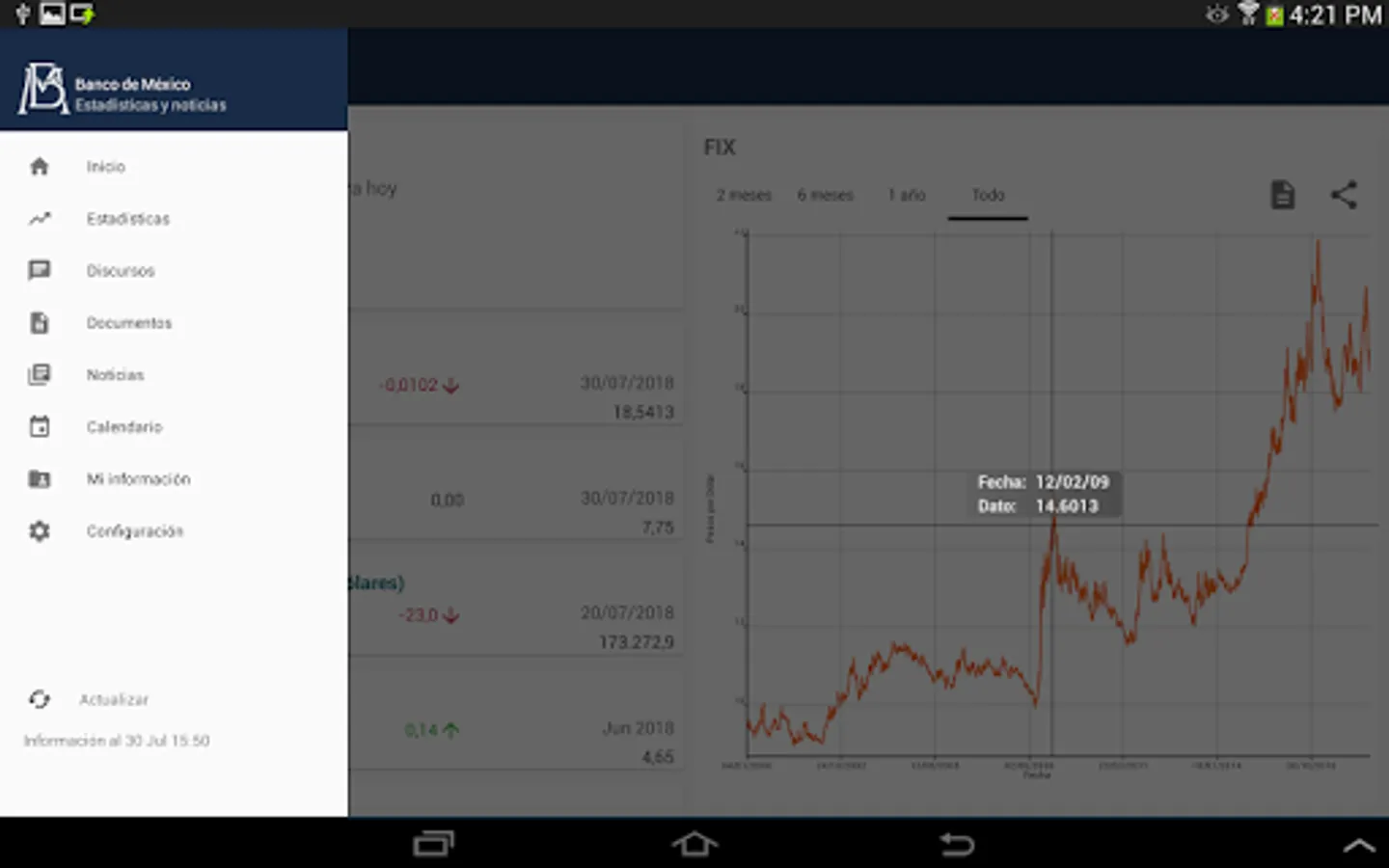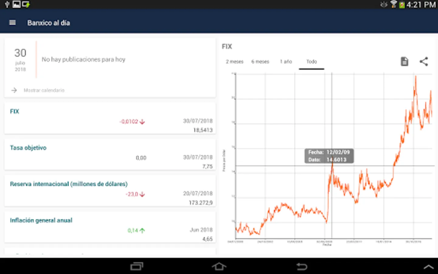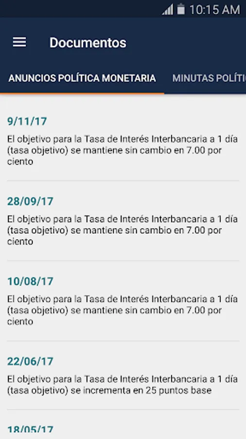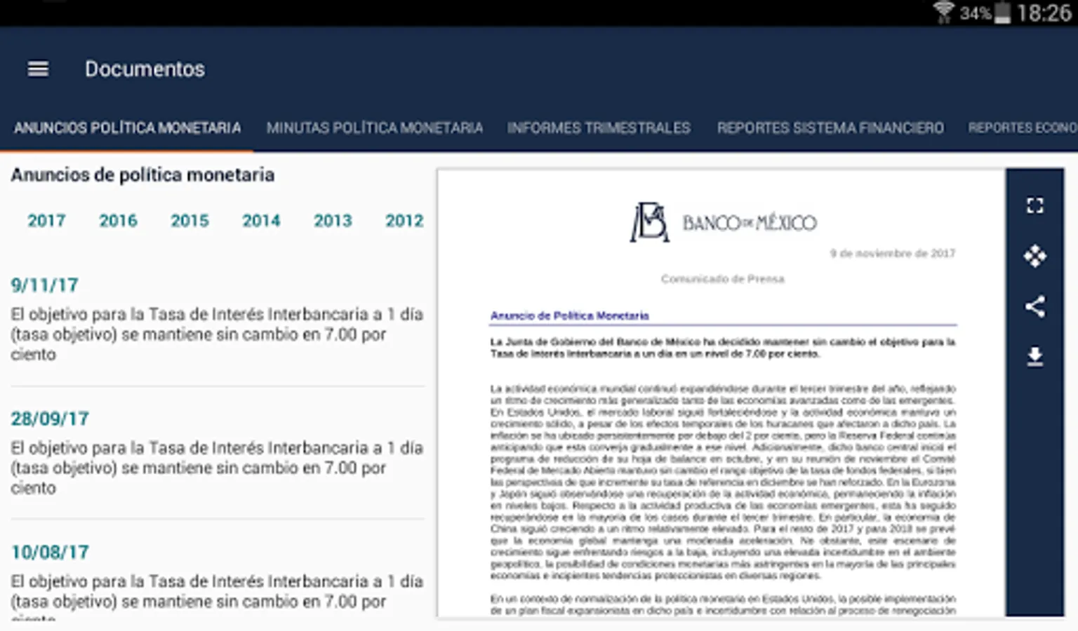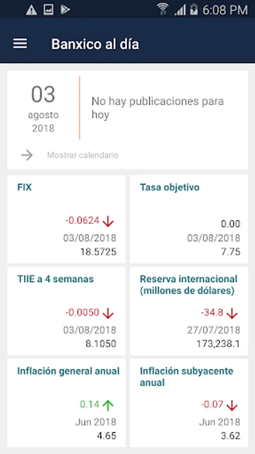 This application allows to see the main economic indicators, latest news and documents published by Banco de Mexico.