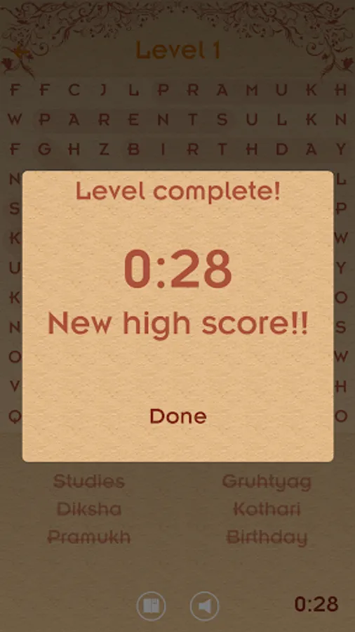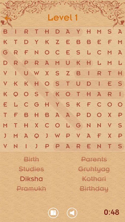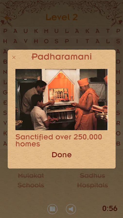 This Word Search App game has been made to express our gratitude to Pramukh Swami Maharaj who lived his life and did everything ‘In the joy of others.” This game is an educational game that enables every player learn about the life of Pramukh Swami Maharaj through four topics:
