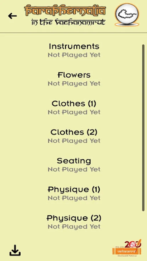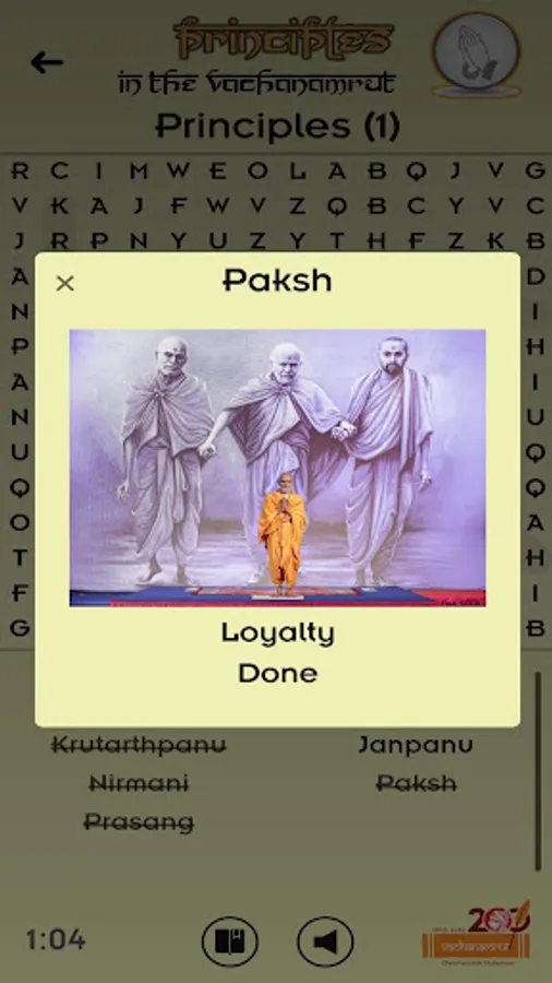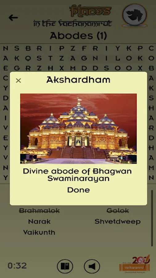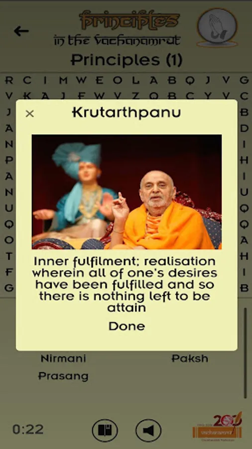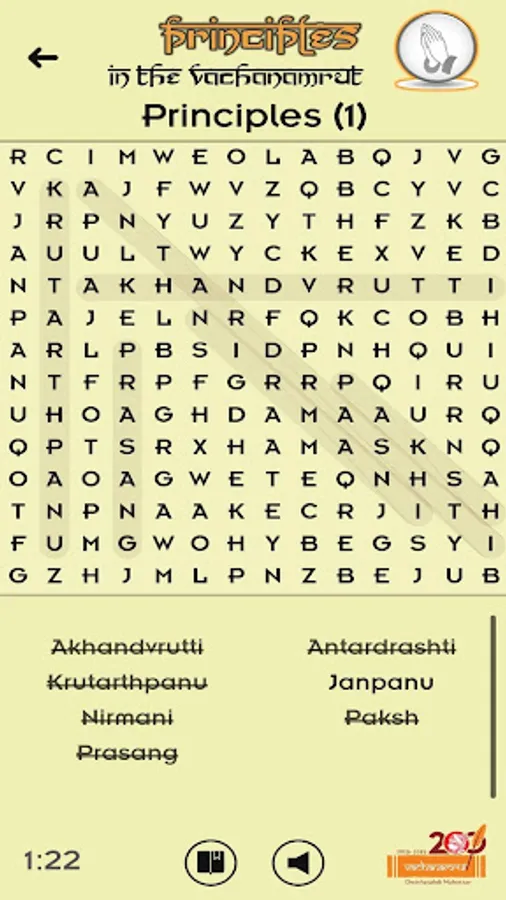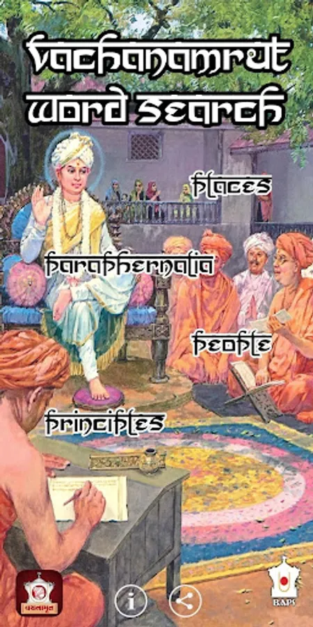 The Vachanamrut is the principal scripture of the Swaminarayan Sampraday. It is a compilation of 273 spiritual discourses delivered by Bhagwan Swaminarayan from 1819 to 1829. Through sermons and question-answer sessions, Bhagwan Swaminarayan provides practical and enlightening guidance on all aspects of spirituality for all spiritual aspirants. This educational game gives every player a deeper insight on various aspects of the Vachanamrut through four topics: