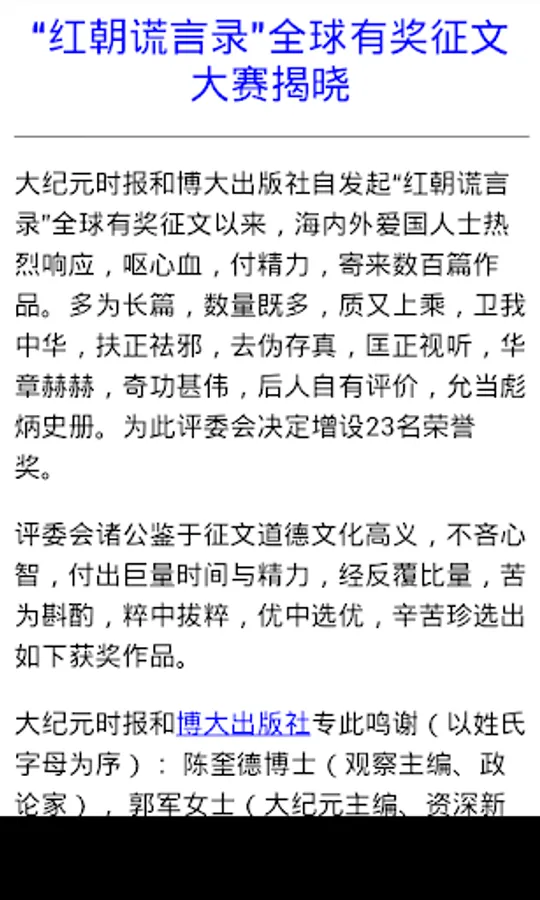 大纪元时报和博大出版社自发起“红朝谎言录”全球有奖征文以来,海内外爱国人士热烈响应,呕心血,付精力,寄来数百篇作品。多为长篇,数量既多,质又上乘,卫我中华,扶正祛邪,去伪存真,匡正视听,华章赫赫,奇功甚伟,后人自有评价,允当彪炳史册。为此评委会决定增设23名荣誉奖。